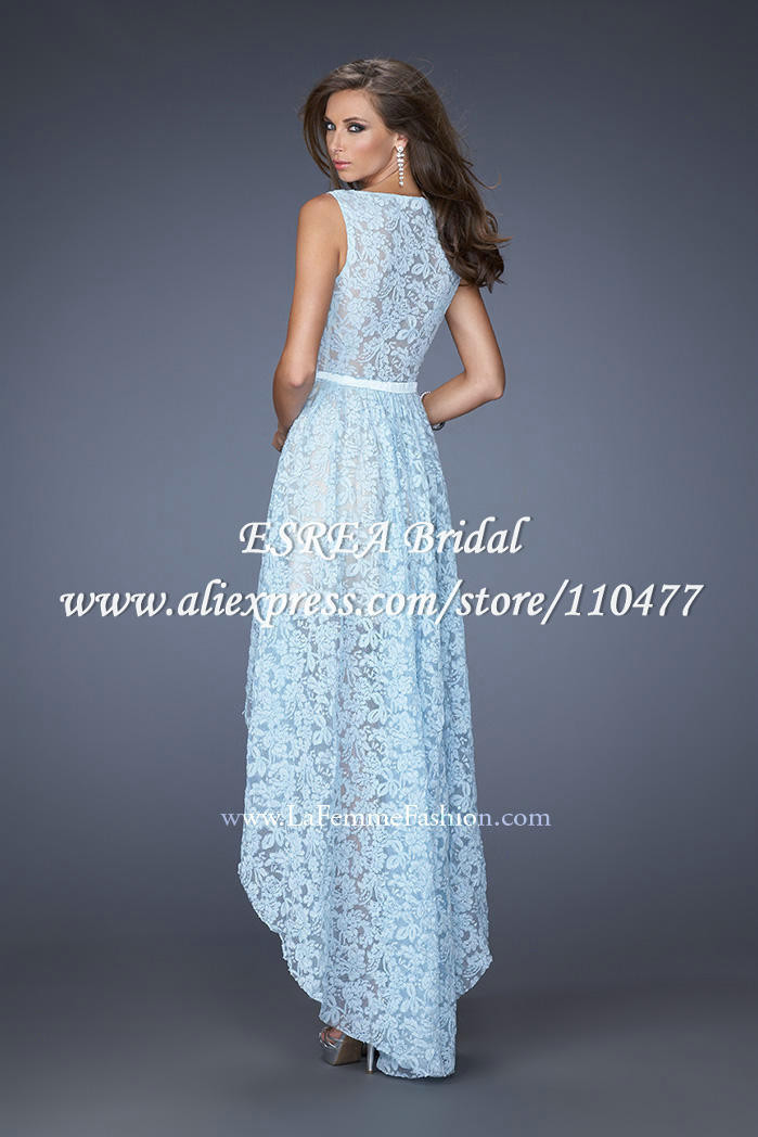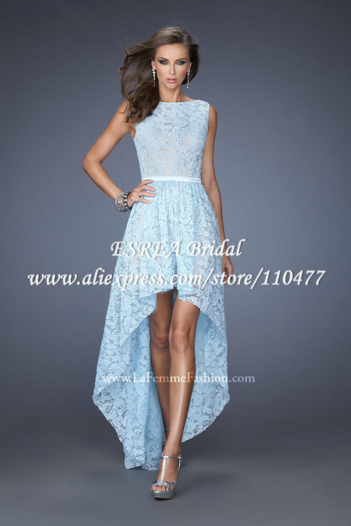 High Neck Cap Sleeve New Designer Light Blue High Low Lace Evening Dress Short Front Long Back 2015 HM605