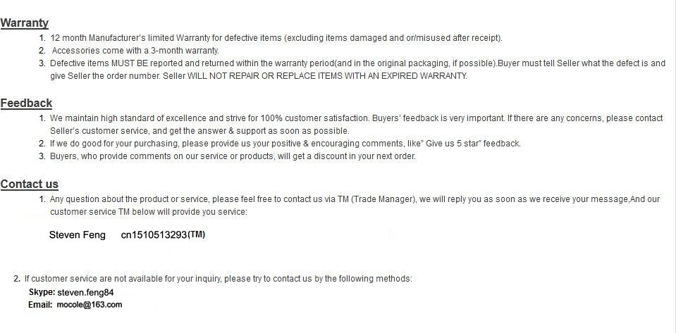 Return PolicyIf the product you receive is not as described or low quality, the seller promises that you may return it before order completion (when you click "Confirm Order Received" or exceed confirmation timeframe) and receive a full refund. The return shipping fee will be paid by you. Or, you can choose to keep the product and agree the refund amount directly with the seller.
