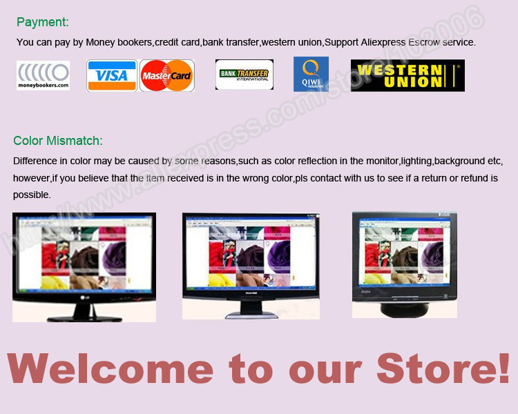 2. Since computer screens have chromatic aberration ,especially between CRT screen and LCD screen,we can not guarantee that the color of our products will be exactly the same with the photos you see.