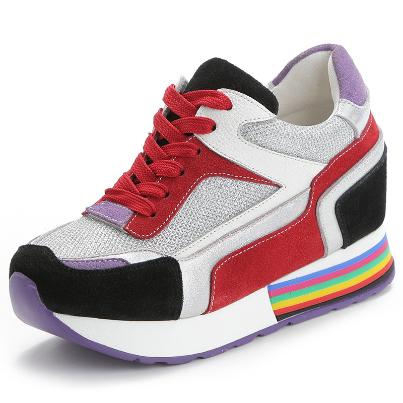 Increased Sports Shoes Casual Shoes European Genuine Leather Mixed Colors Sneakers Lace-up Shoes Women Wedages Sneakers