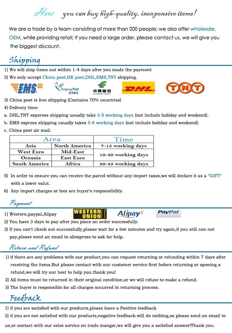 | Seller Service | On-time DeliveryIf you do not receive your purchase within 60 days, you can ask for a full refund before order completion (when you click "Confirm Order Received" or exceed confirmation timeframe). |