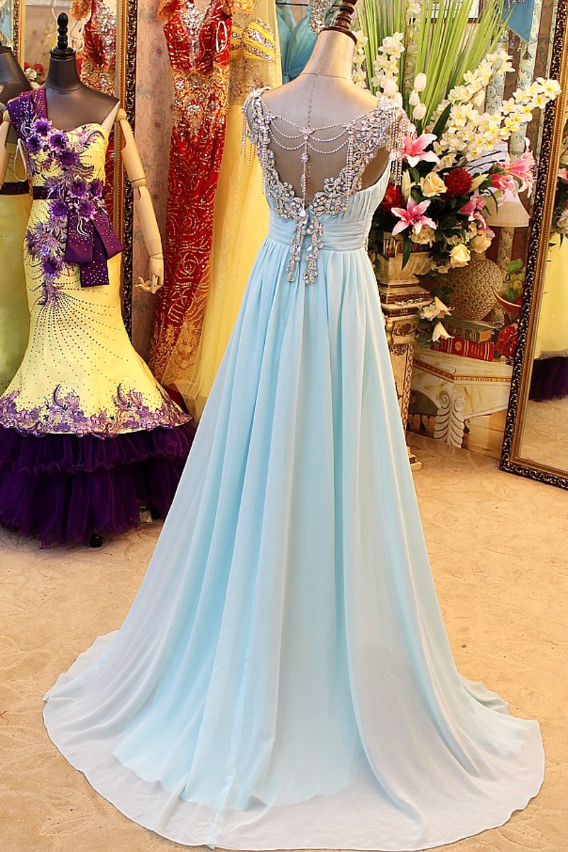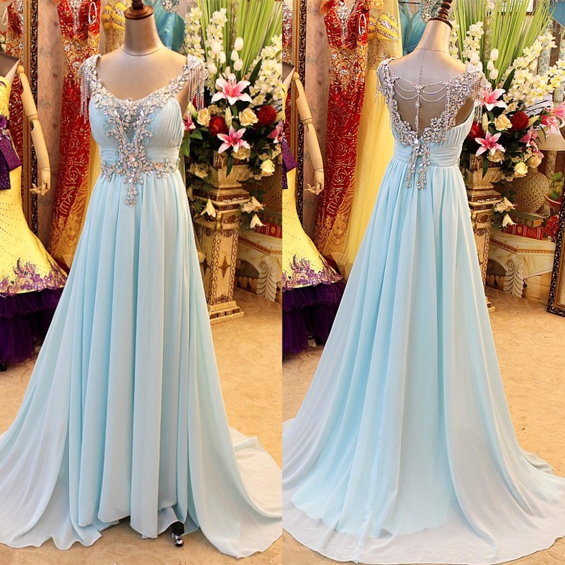 Luxury Crystal Long Evening Dresses A-Line Sexy Light BlueChiffon Prom Gowns Hollow Back 2015 new arrival vestido de festa