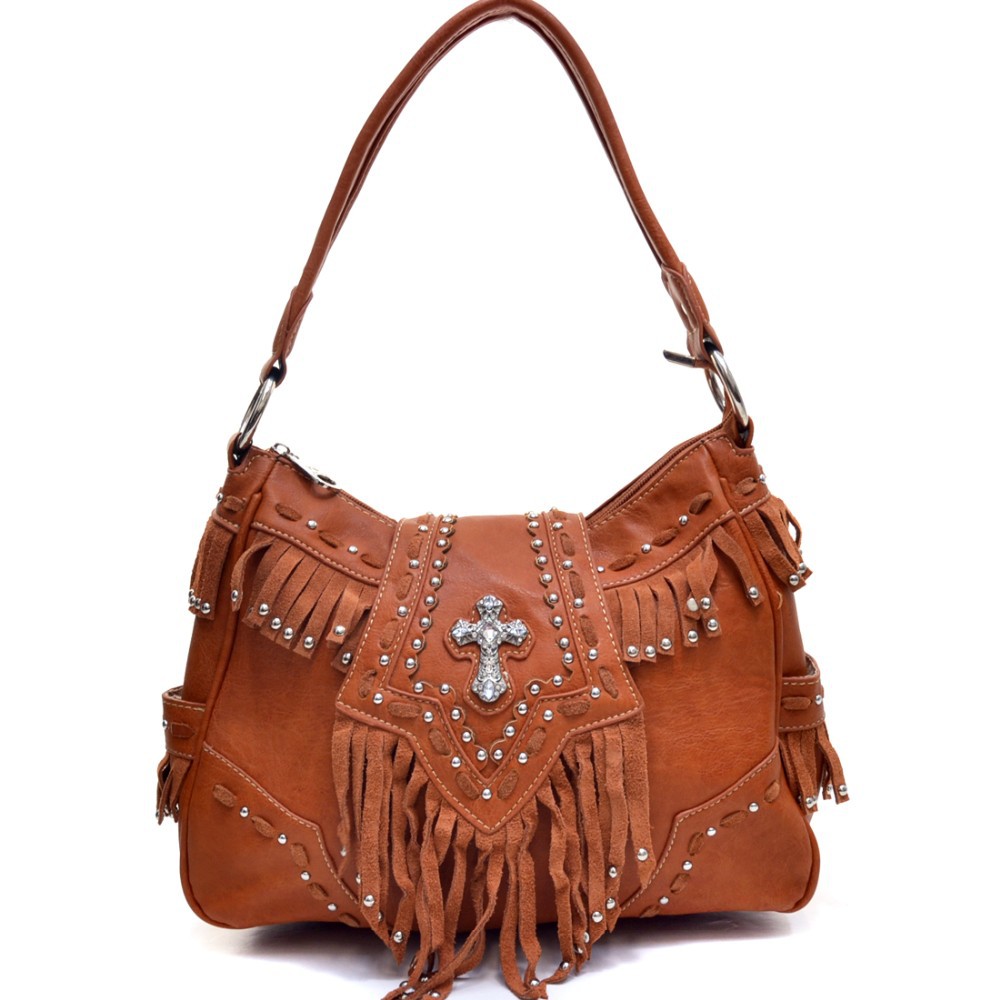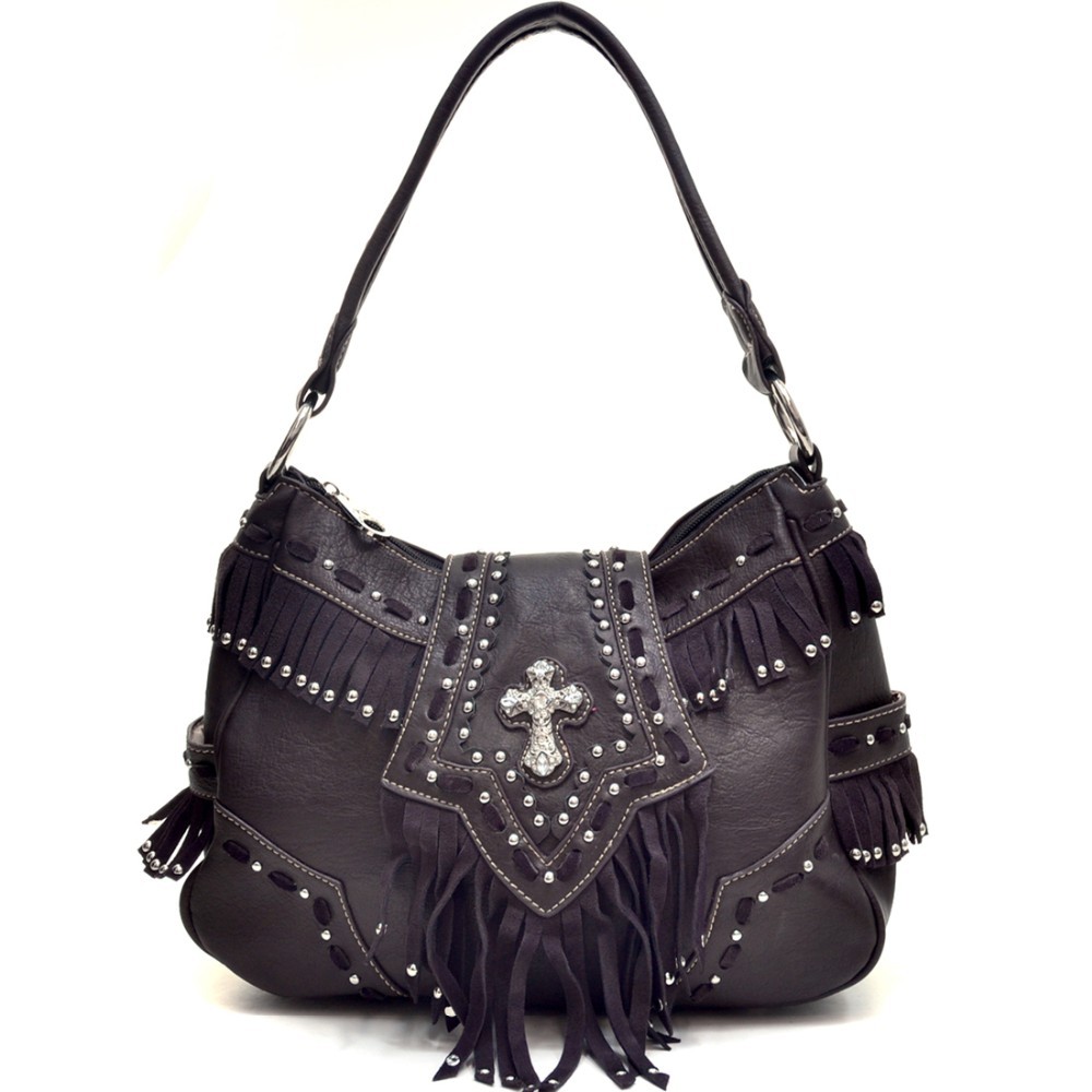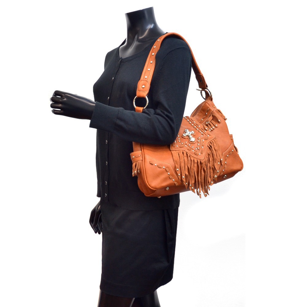 Montana West Gothic Cross Handbag with Faux Suede Studded Fringe for Women