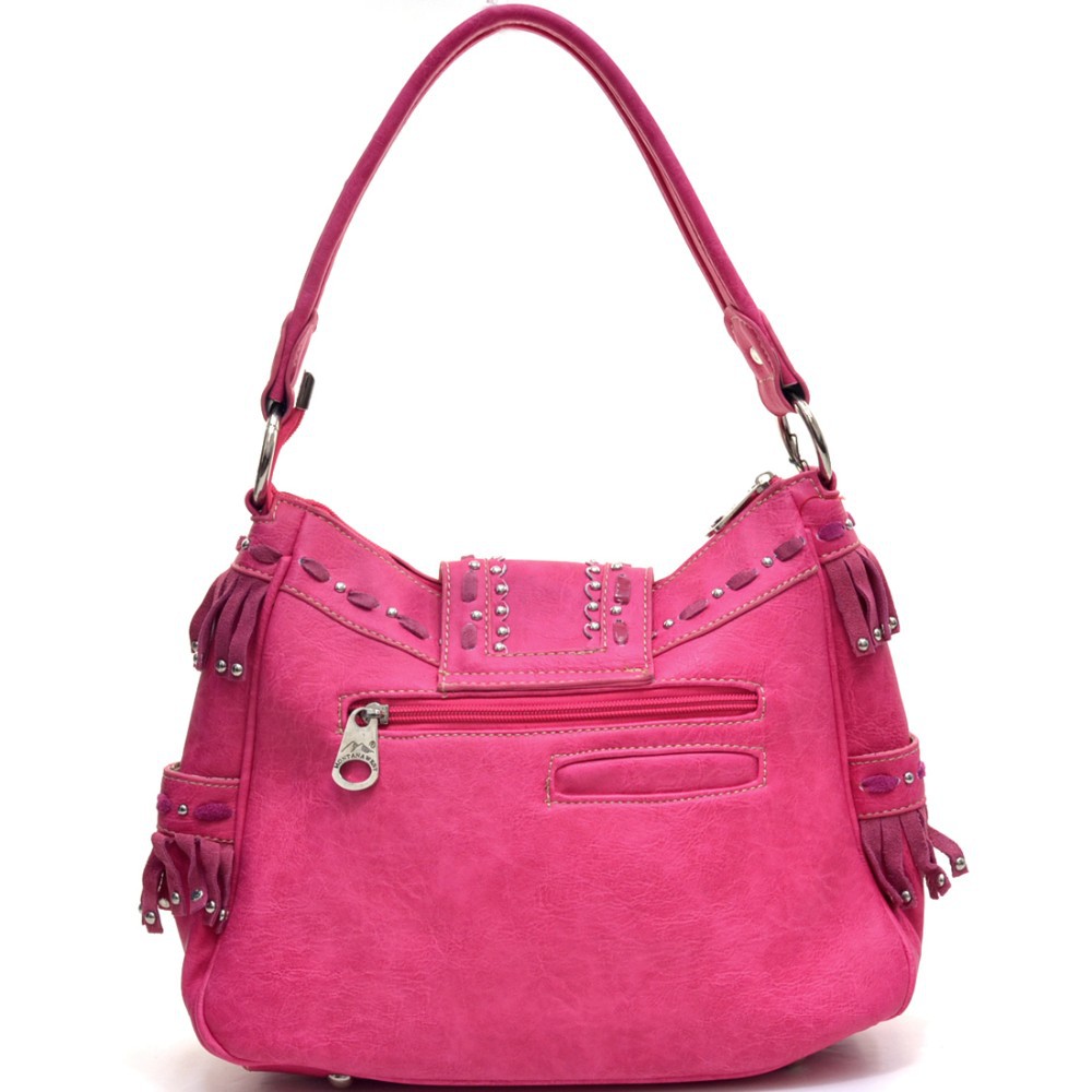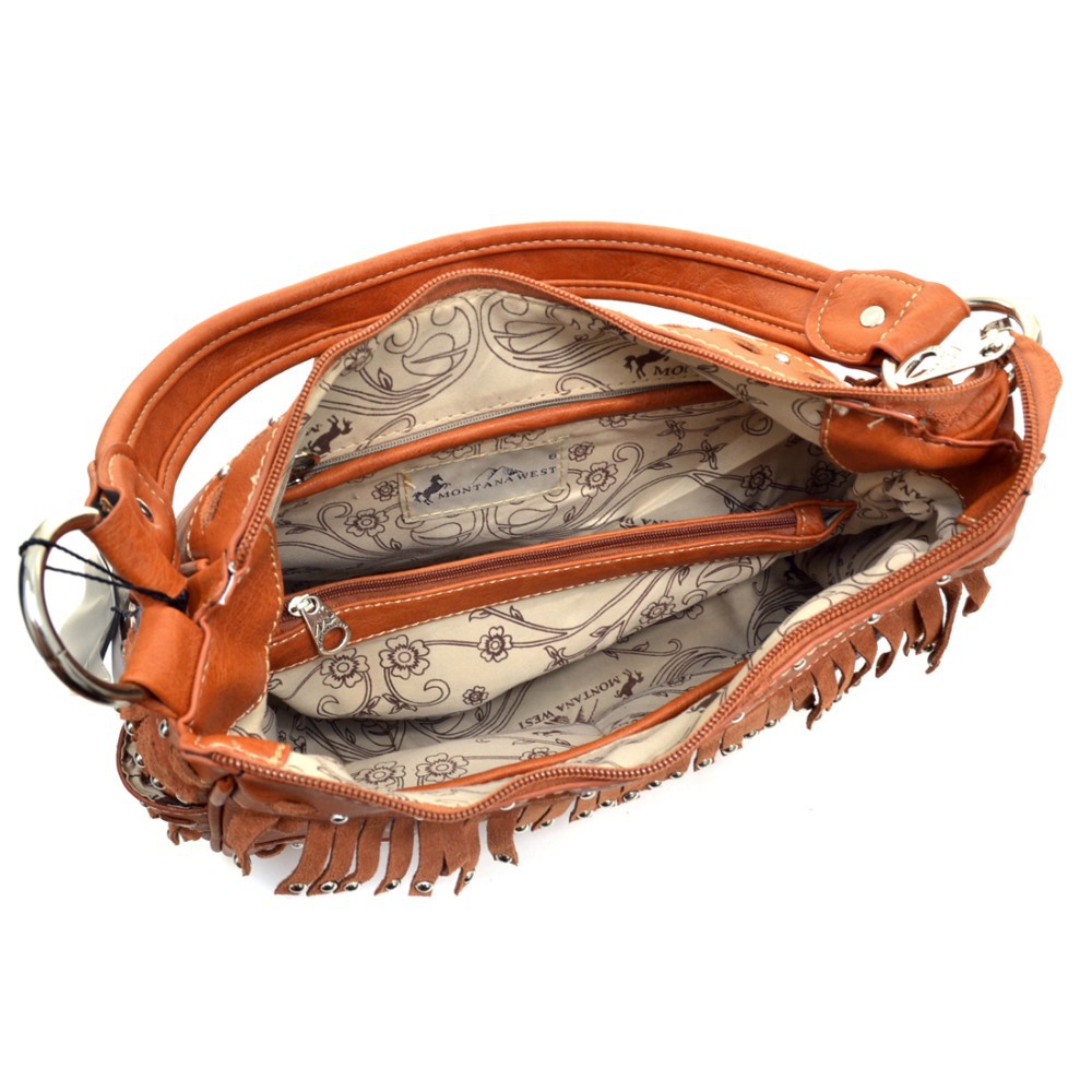 Studded, faux suede fringe and stitching make this the Western lady’s Cowgirl up Bag for all seasons! With an intricate silver tone cross inlaid with imperial and princess cut Rhinestone studs, studded, flat bottom and a fabric printed floral interior full of pouches and pockets to spare, you will want to make this trendy bag your grab and go accessory. Who has more fun than fringe?! Faux Leather Top Zipper Closure & Fringed Fold Over Magnetic Snap Front Closure External Side Magnetic Snap Open Top Pockets External Back Zipper Pocket & Open Top Pouch Flat Bottom, Studded Design Studded Silver Tone Faux Leather Shoulder Strap With Silver Tone Rings Interior Center Divider Large Zipper Pocket Montana West® Floral Print Fabric Interior Interior Back Wall Zipper Pocket Matching Silver Tone Zipper Pulls, Rings and Studs Approx. Size: 12″W x 9.75″H x 4.25″D Strap Drop Length: 11″