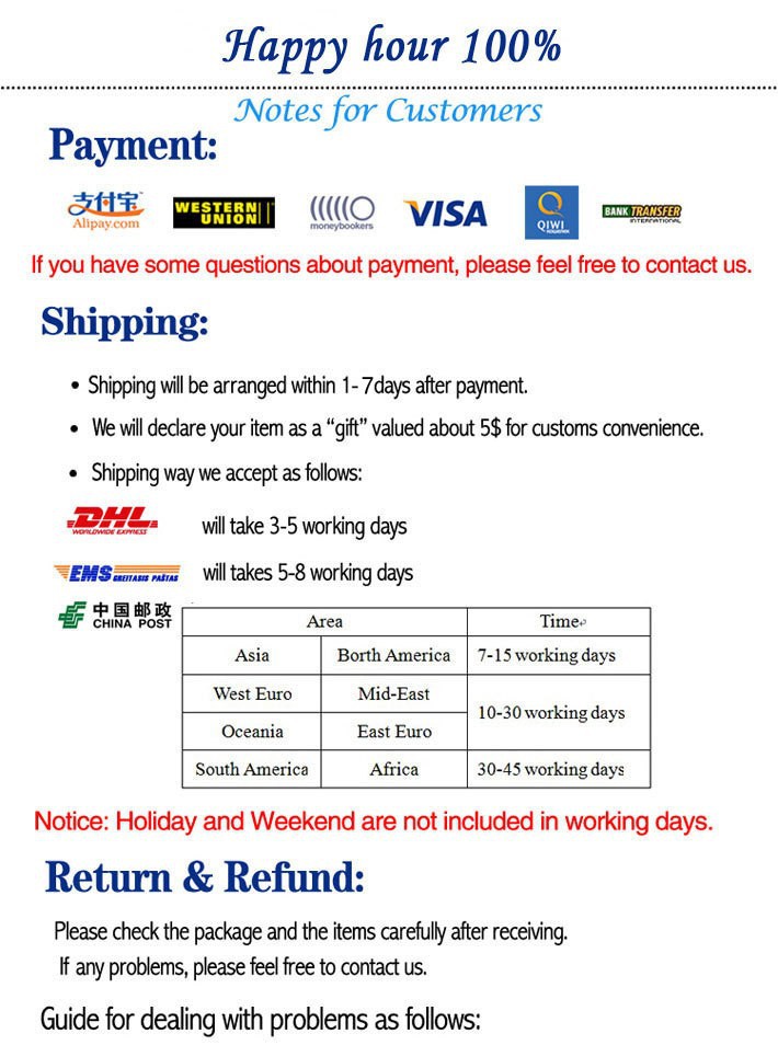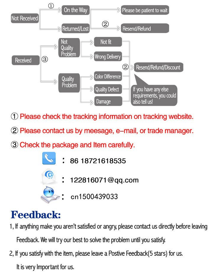All of our offers are backed by 100% satisfaction guarantee. if there is any quality problem for the goods after you received, please kindly contact us firstly, and please take a photo to us, after we confirmed, we will offer full refund or exchange or resend.