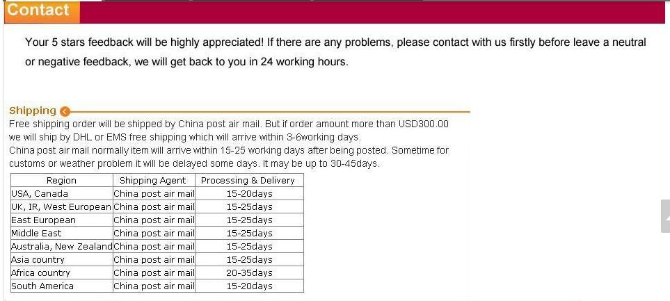 Seller ServiceOn-time DeliveryIf you do not receive your purchase within 60 days, you can ask for a full refund before order completion (when you click "Confirm Order Received" or exceed confirmation timeframe).