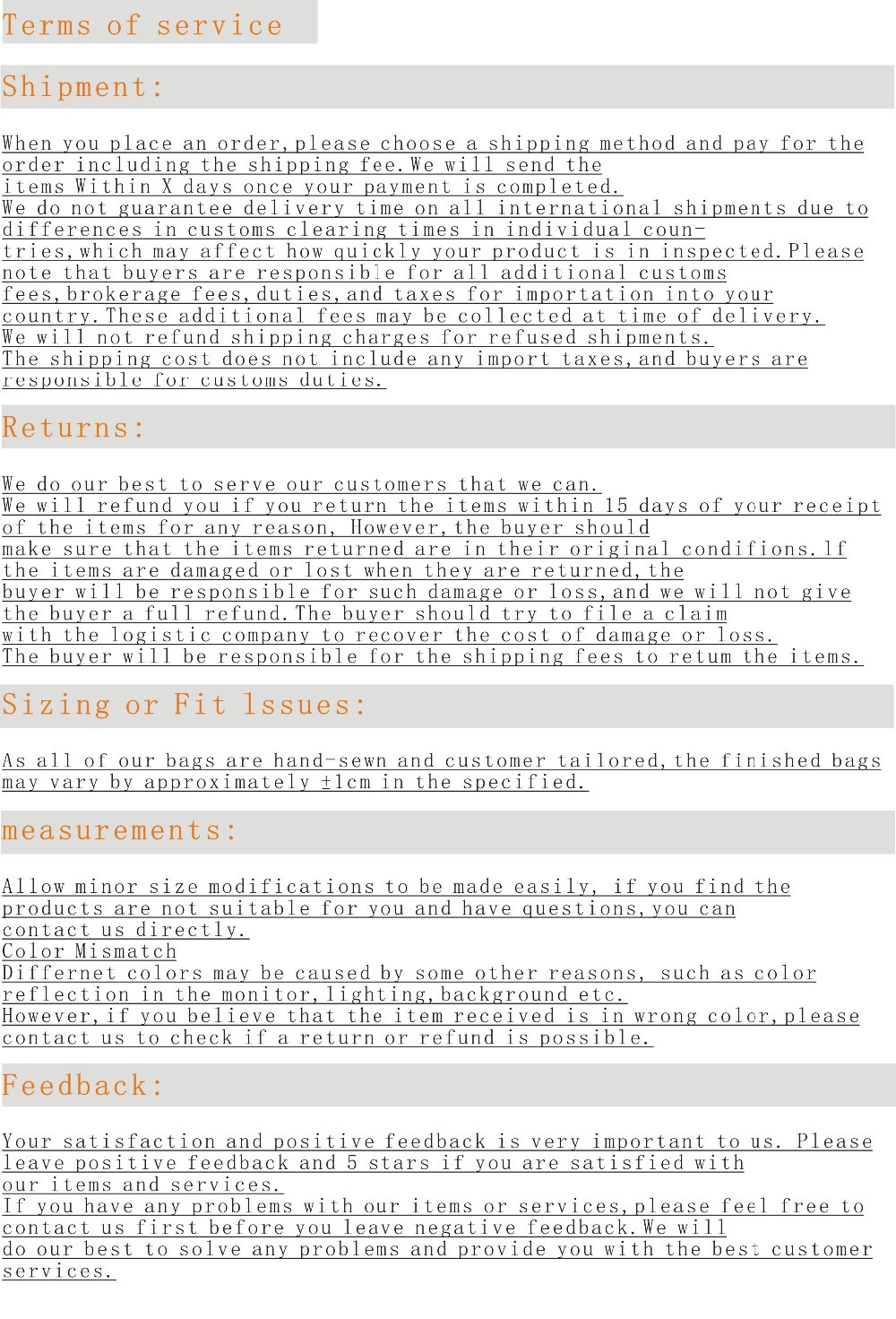 | Seller Service | On-time DeliveryIf you do not receive your purchase within 60 days, you can ask for a full refund before order completion (when you click "Confirm Order Received" or exceed confirmation timeframe). |