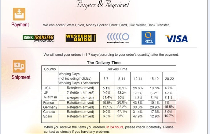 | Seller Service | On-time DeliveryIf you do not receive your purchase within 60 days, you can ask for a full refund before order completion (when you click "Confirm Order Received" or exceed confirmation timeframe). |