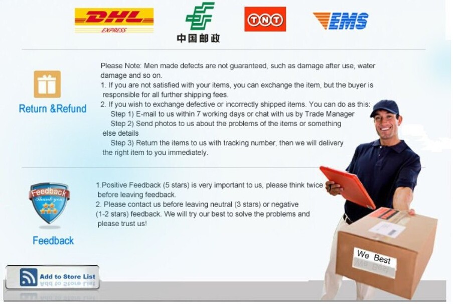 Return PolicyIf the product you receive is not as described or low quality, the seller promises that you may return it before order completion (when you click "Confirm Order Received" or exceed confirmation timeframe) and receive a full refund. The return shipping fee will be paid by you. Or, you can choose to keep the product and agree the refund amount directly with the seller.