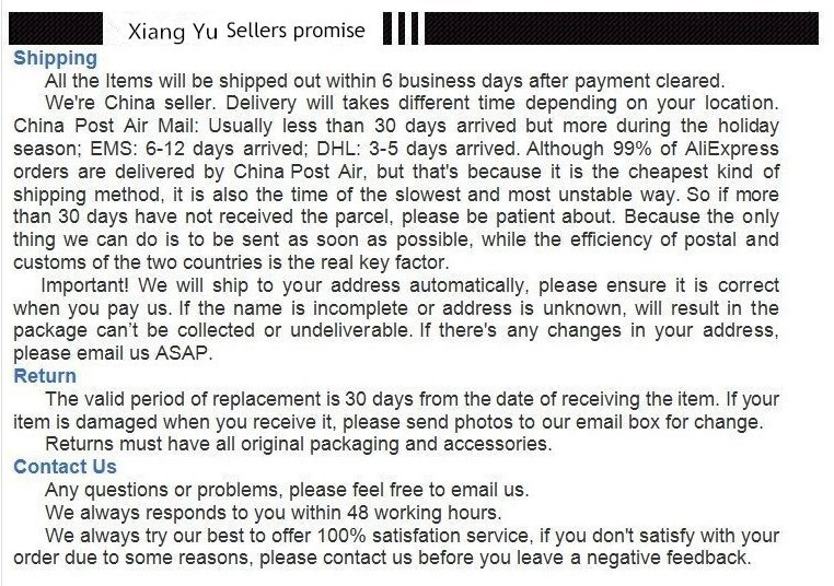 | Seller Service | On-time DeliveryIf you do not receive your purchase within 60 days, you can ask for a full refund before order completion (when you click "Confirm Order Received" or exceed confirmation timeframe). |