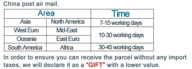 | Post Air Mail | Free Shipping | 15 - 45 days |