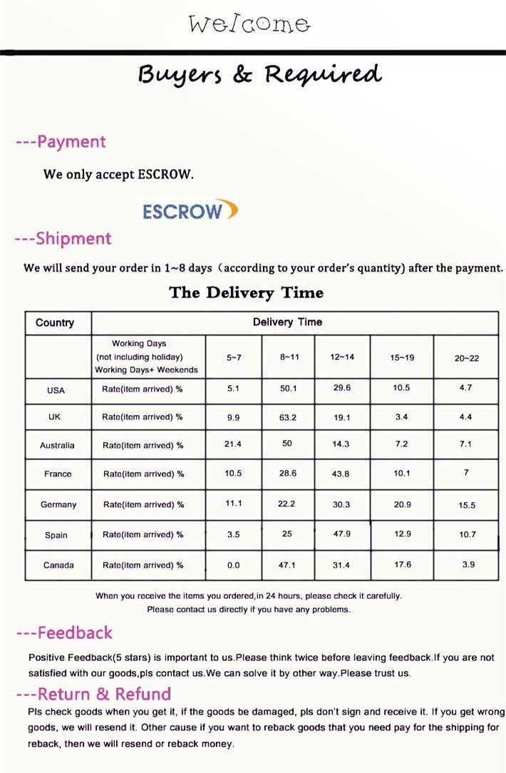 | Seller Service | On-time DeliveryIf you do not receive your purchase within 60 days, you can ask for a full refund before order completion (when you click "Confirm Order Received" or exceed confirmation timeframe). |