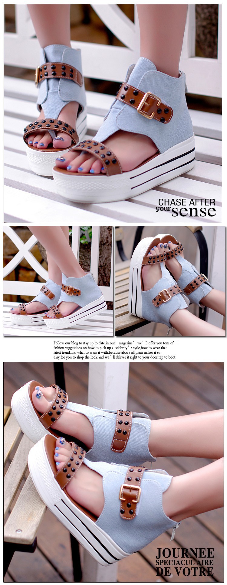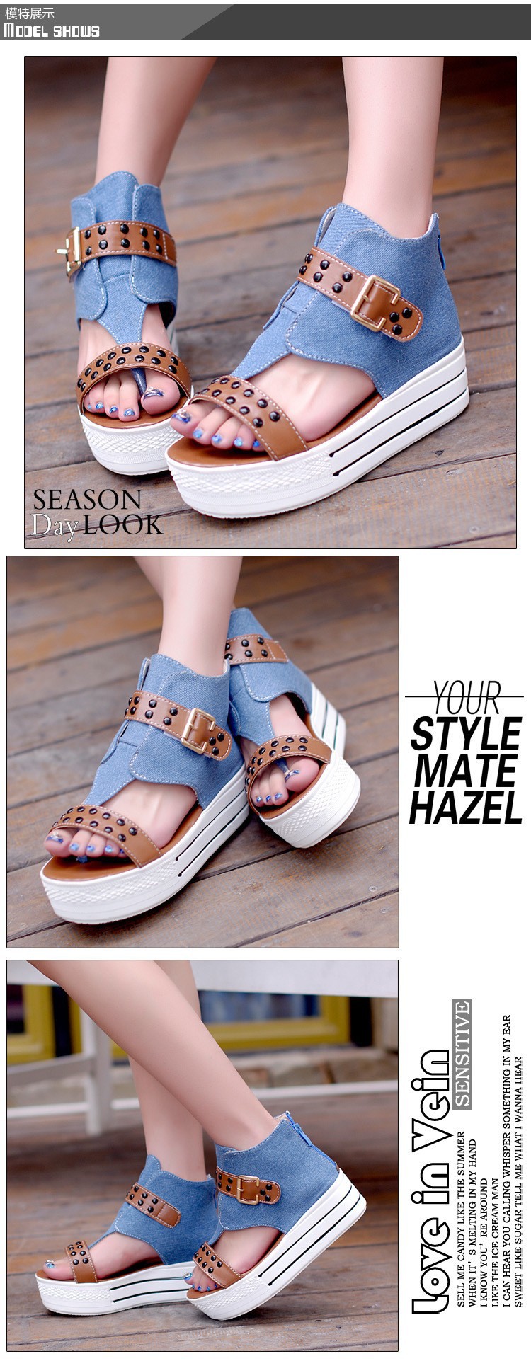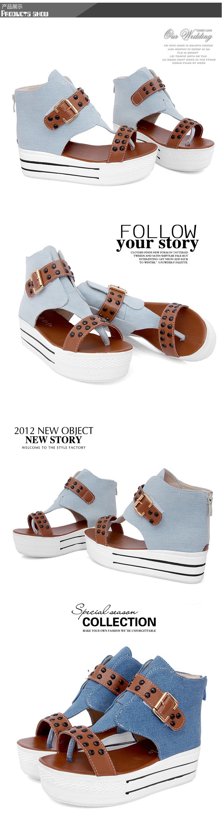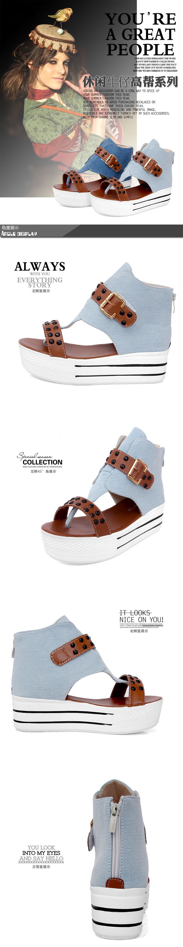 New wave of summer 2014 shoes Roman fish head rivets canvas shoes with thick soles platform slope with high-heeled sandals