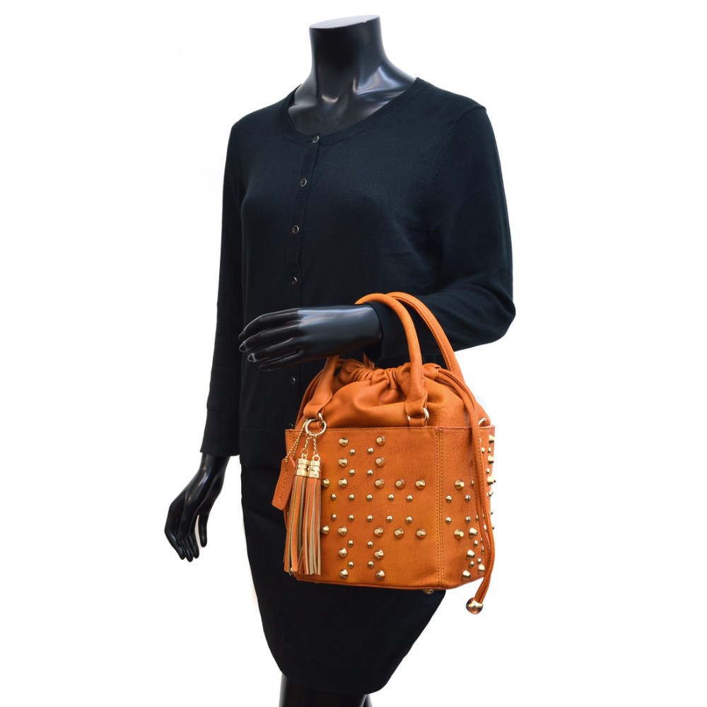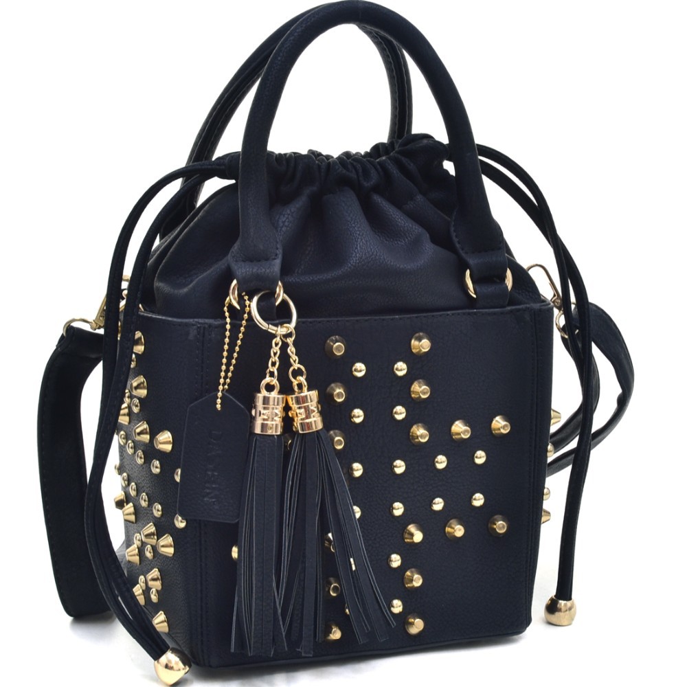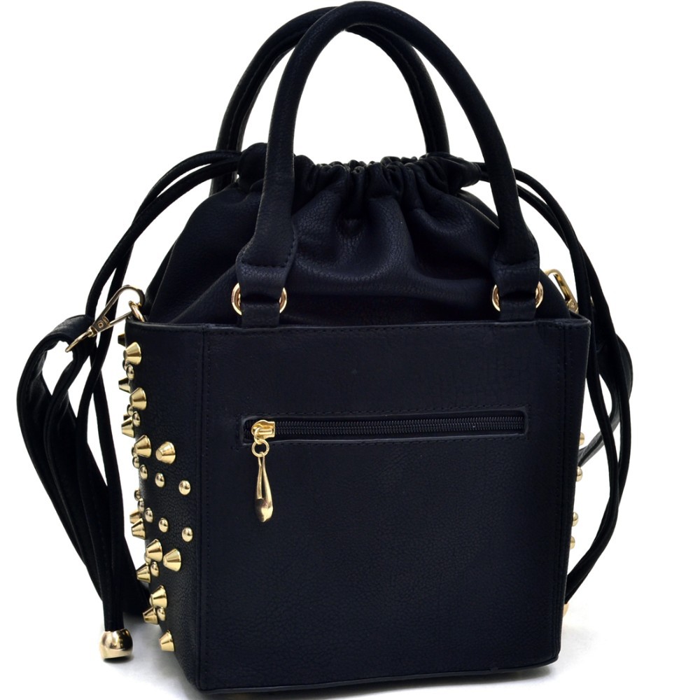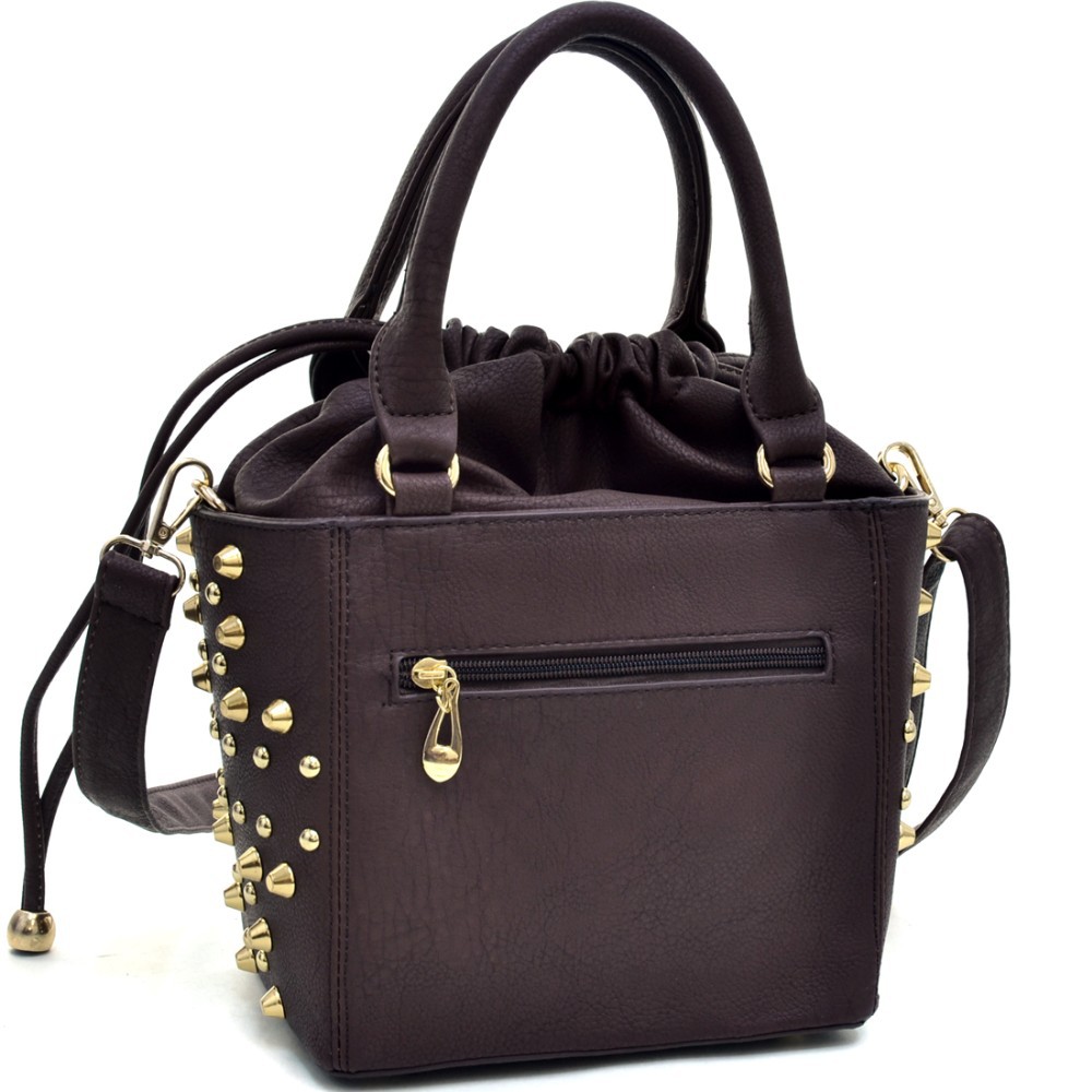 How adorable is this petite studded satchel? When you’re looking to carry a handbag, but want to travel light, then this trendy studded little satchel is what you are looking for. The drawstring closure adds a laid back vibe to this bold style.