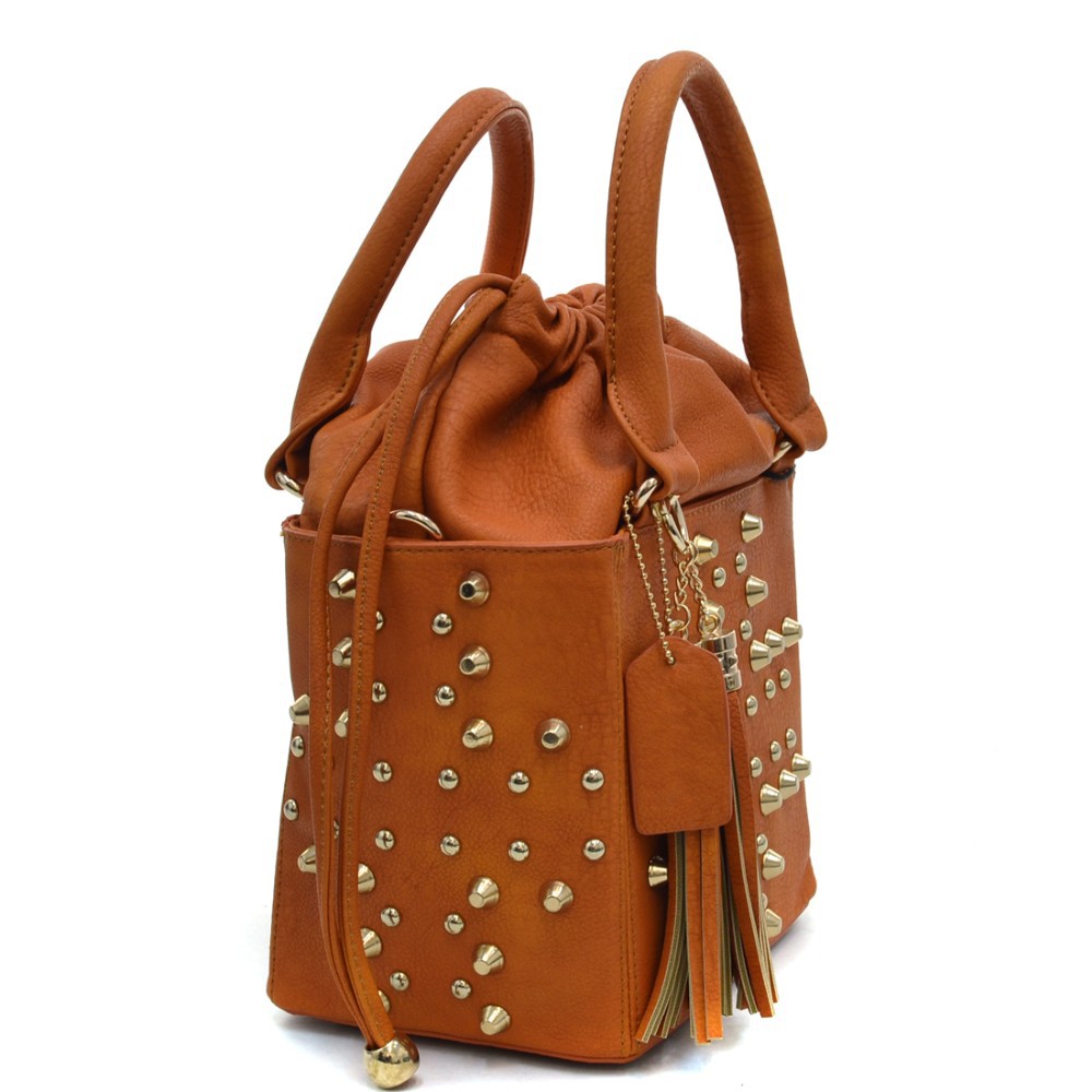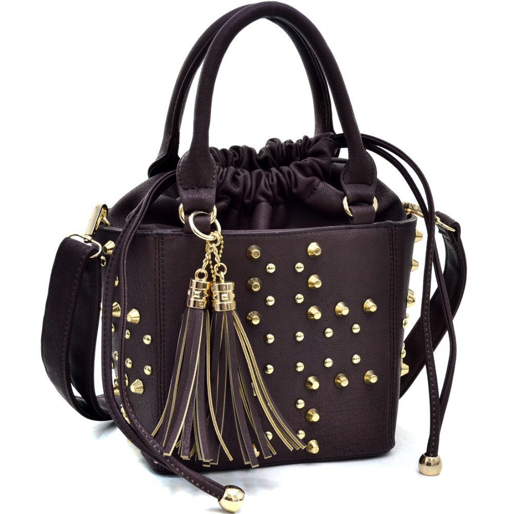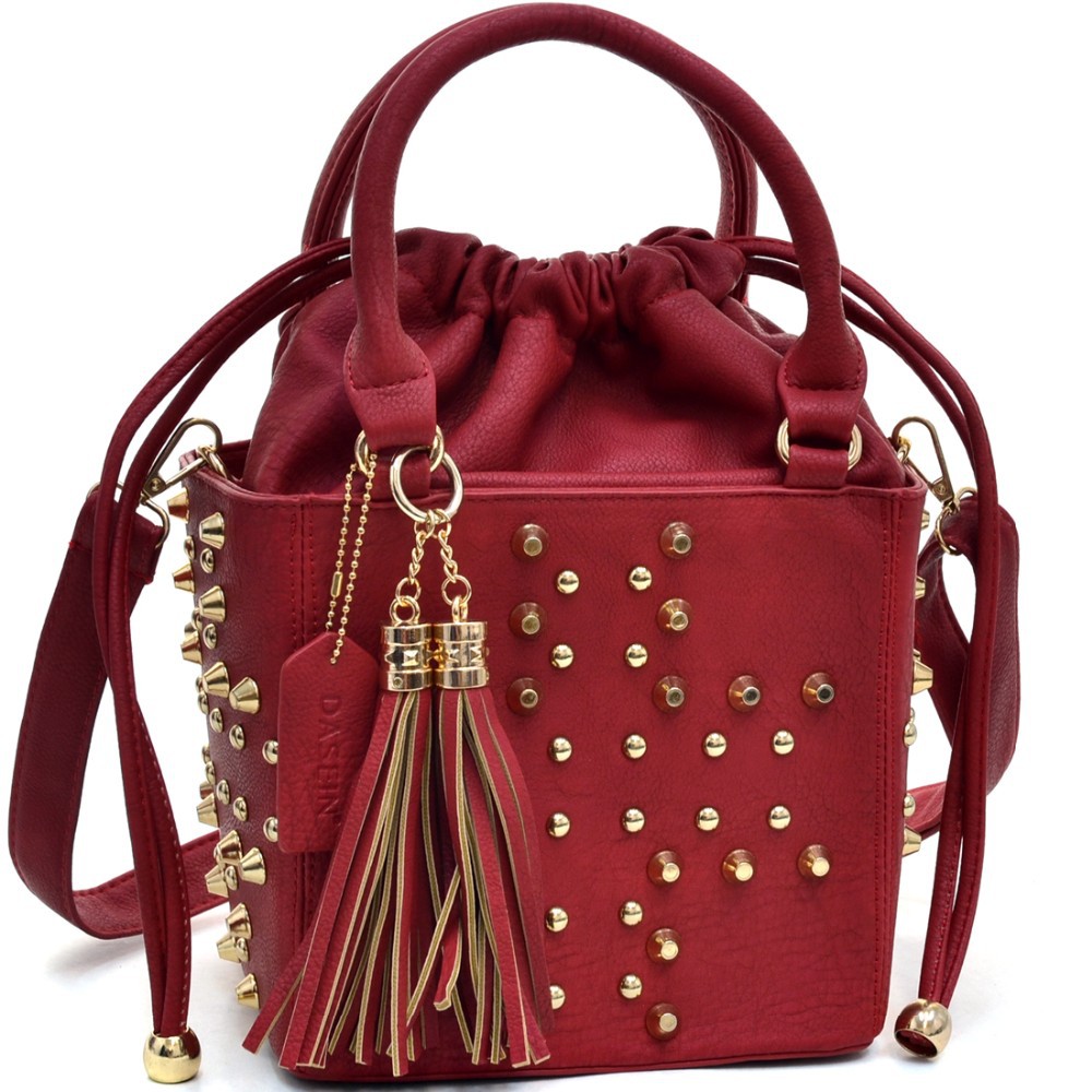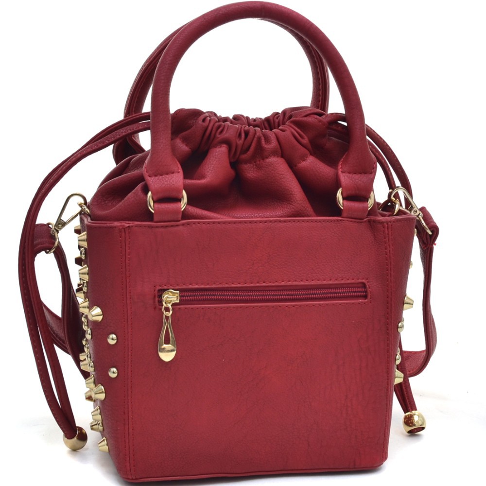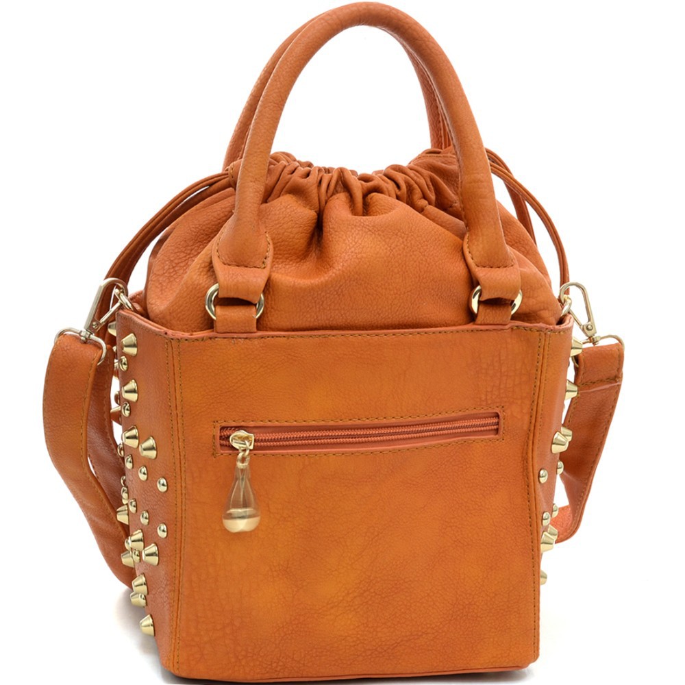 How adorable is this petite studded satchel? When you’re looking to carry a handbag, but want to travel light, then this trendy studded little satchel is what you are looking for. The drawstring closure adds a laid back vibe to this bold style.