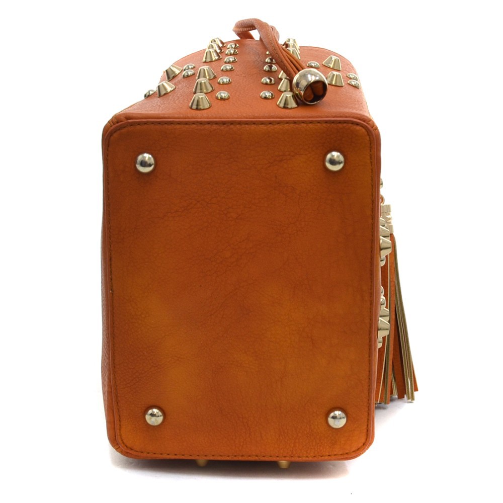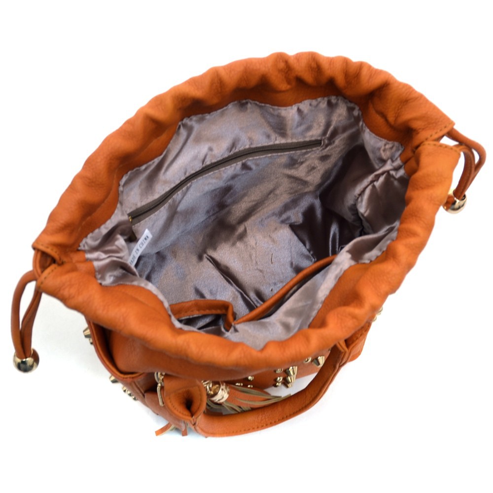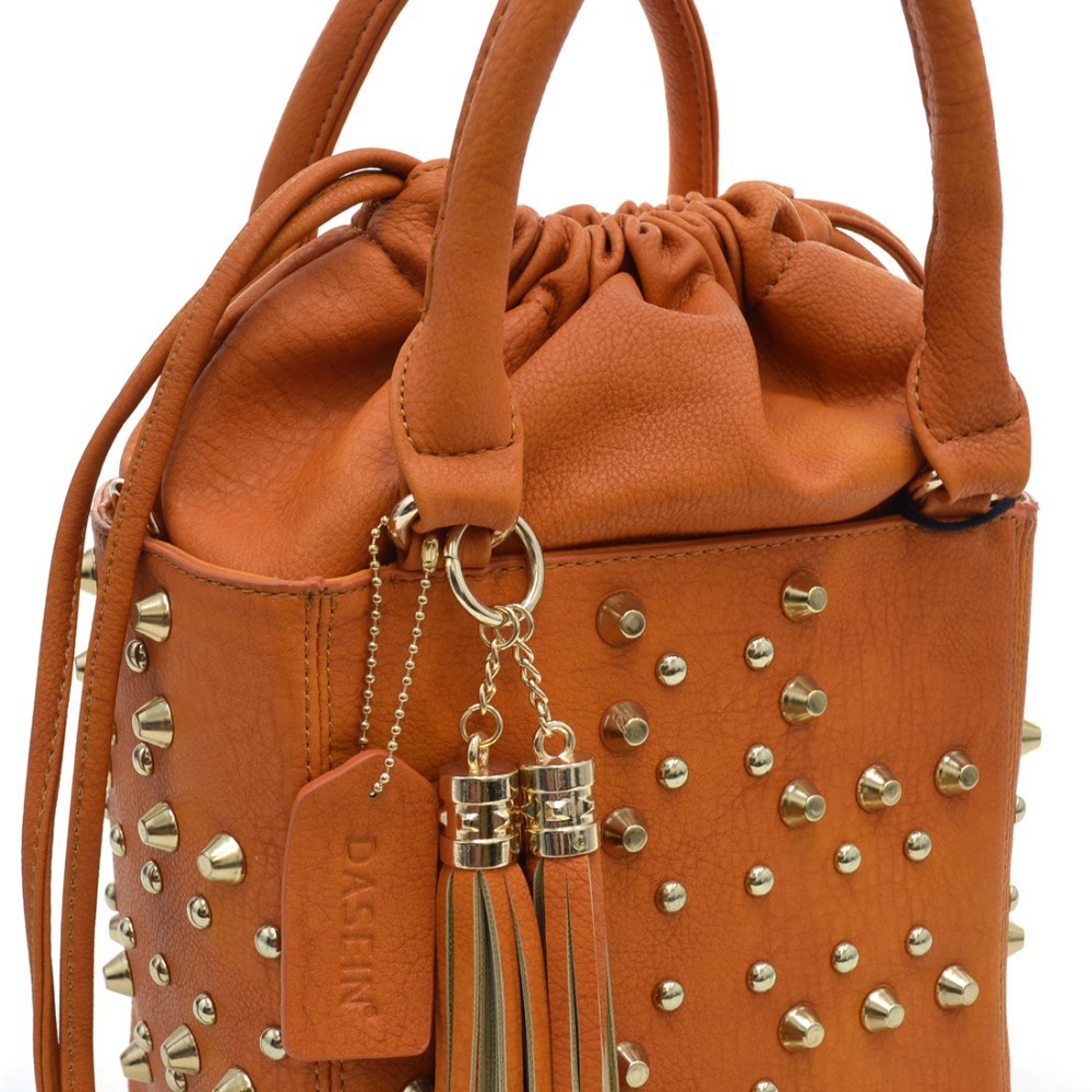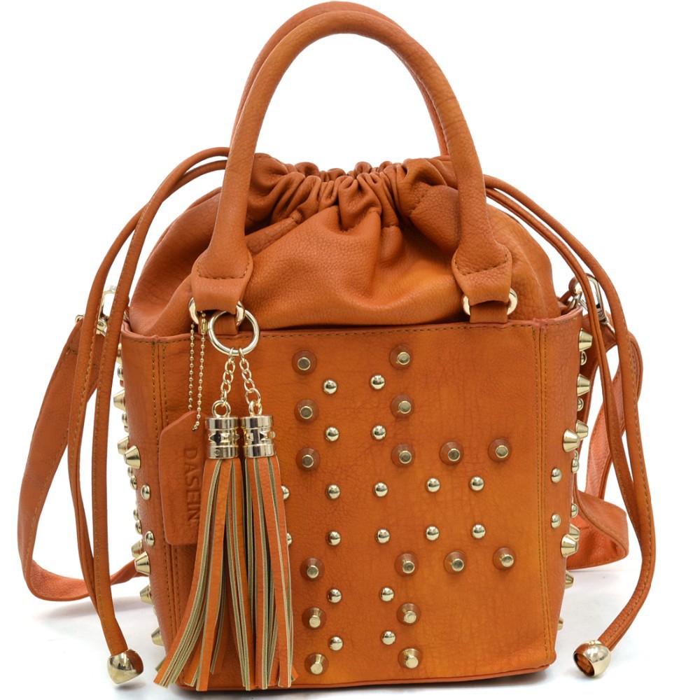 How adorable is this petite studded satchel? When you’re looking to carry a handbag, but want to travel light, then this trendy studded little satchel is what you are looking for. The drawstring closure adds a laid back vibe to this bold style.