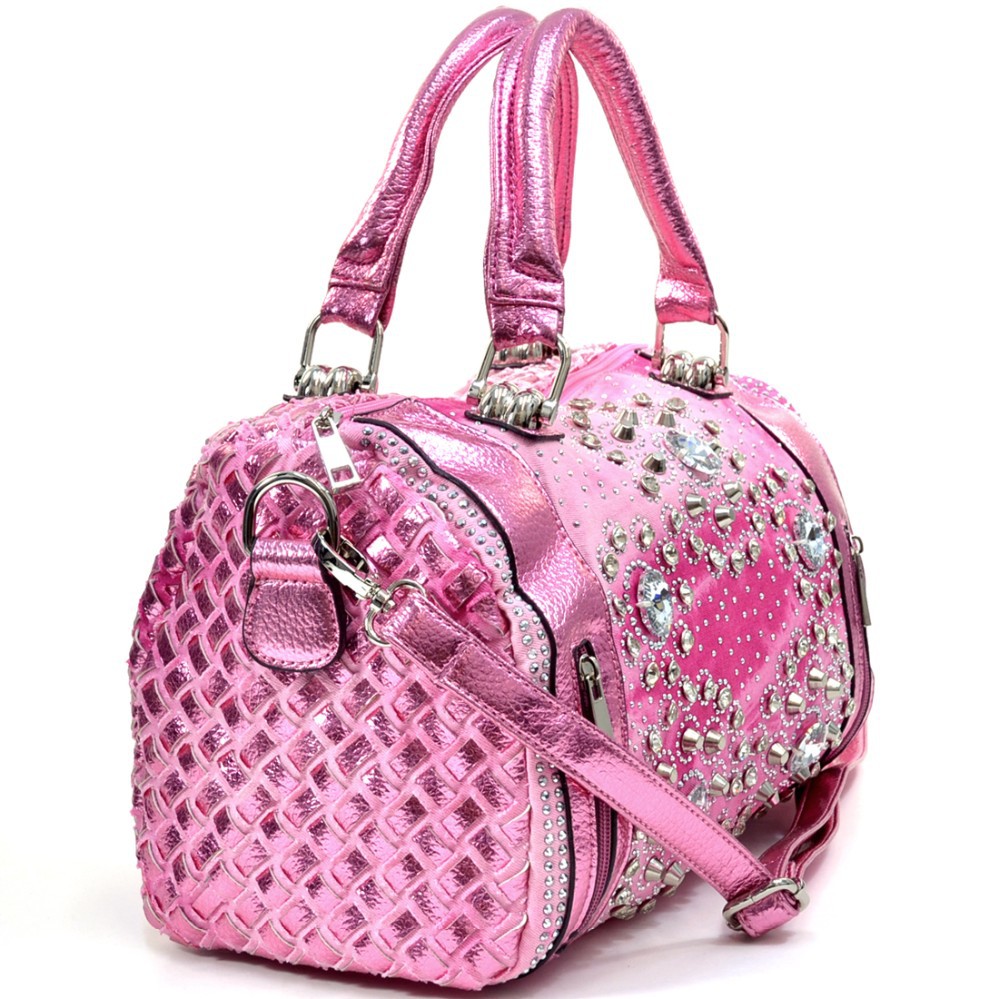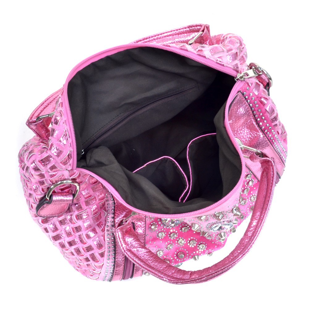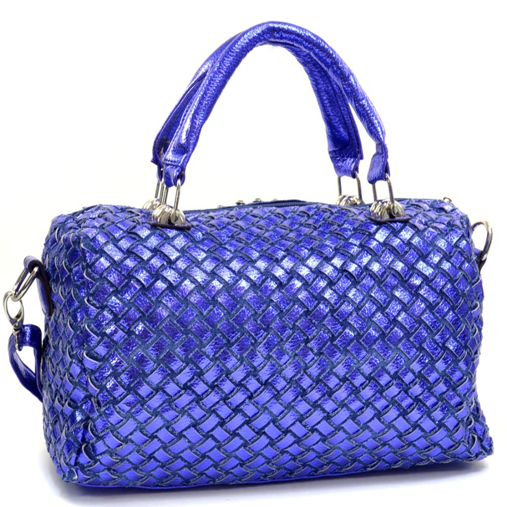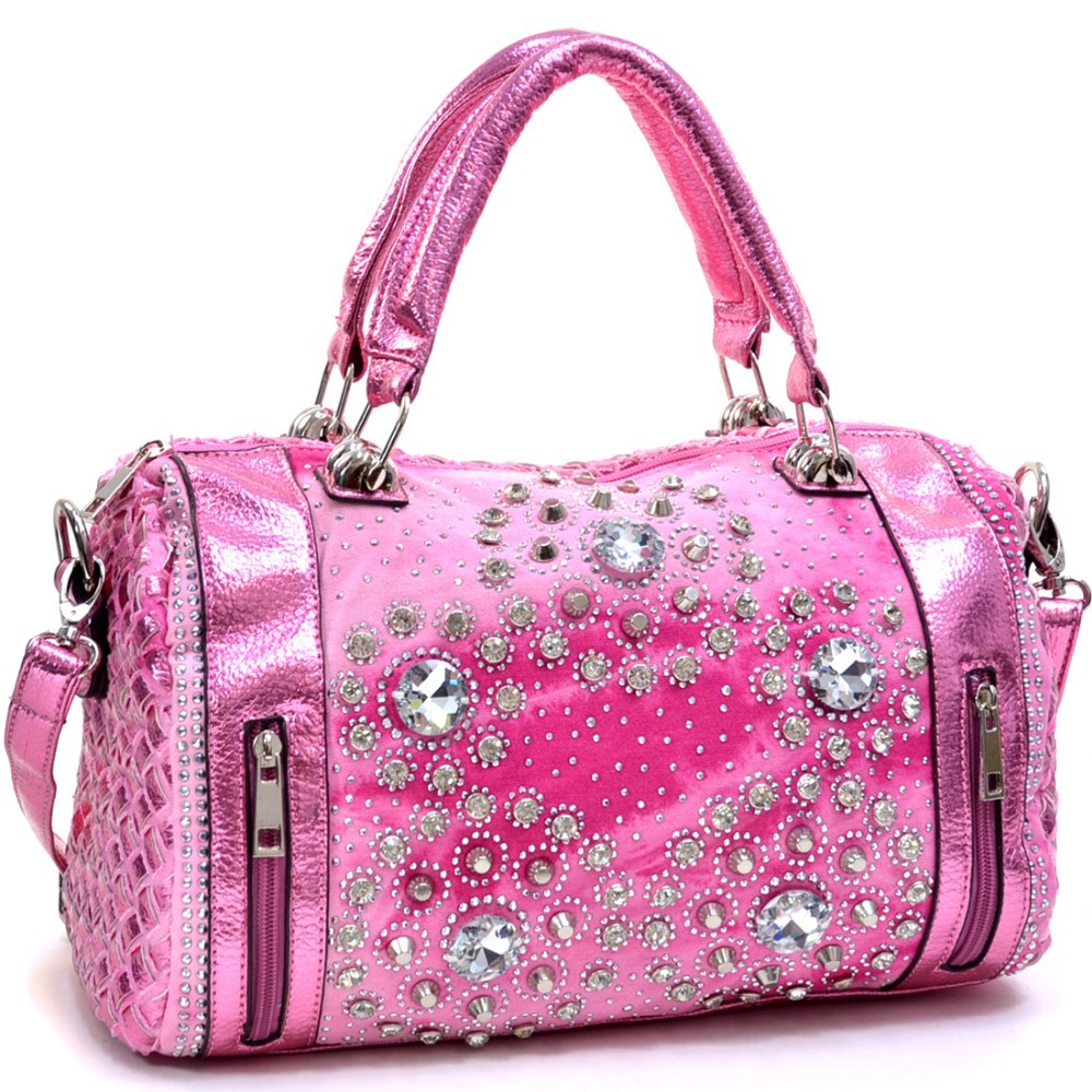 Summer Denim Chic has hit the streets! From New York to Italy and back, denim and diamonds are making a charge off the runway and this trendy Rhinestone studded shoulder bag is going right along with it. Woven together, metallic faux leather and denim strips give this bag a stunning texture while the hinge handles add a unique style accent. This bag is an instant daily pick me up to any outfit with details that are as eye popping as they are convenient. Front panel mini zip up pockets are the perfect place to keep keys, lip balm, change or that elusive package of gum while the flat bottom design and roomy interior make bringing wallet, sunglasses and that great Summer novel a breeze.