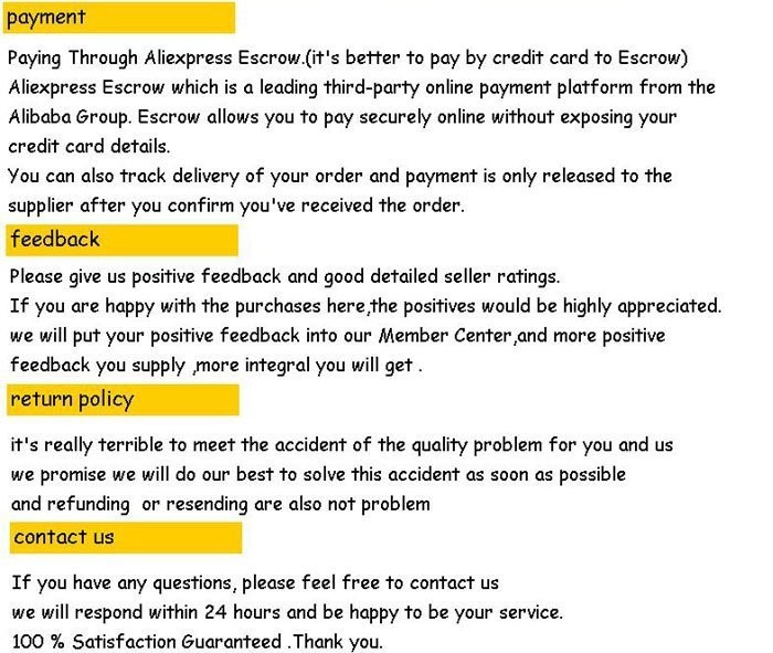 Return PolicyIf the product you receive is not as described or low quality, the seller promises that you may return it before order completion (when you click "Confirm Order Received" or exceed confirmation timeframe) and receive a full refund. The return shipping fee will be paid by you. Or, you can choose to keep the product and agree the refund amount directly with the seller.