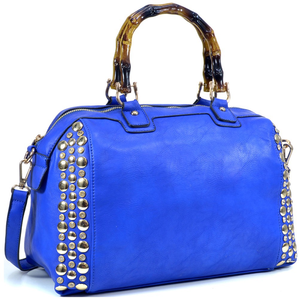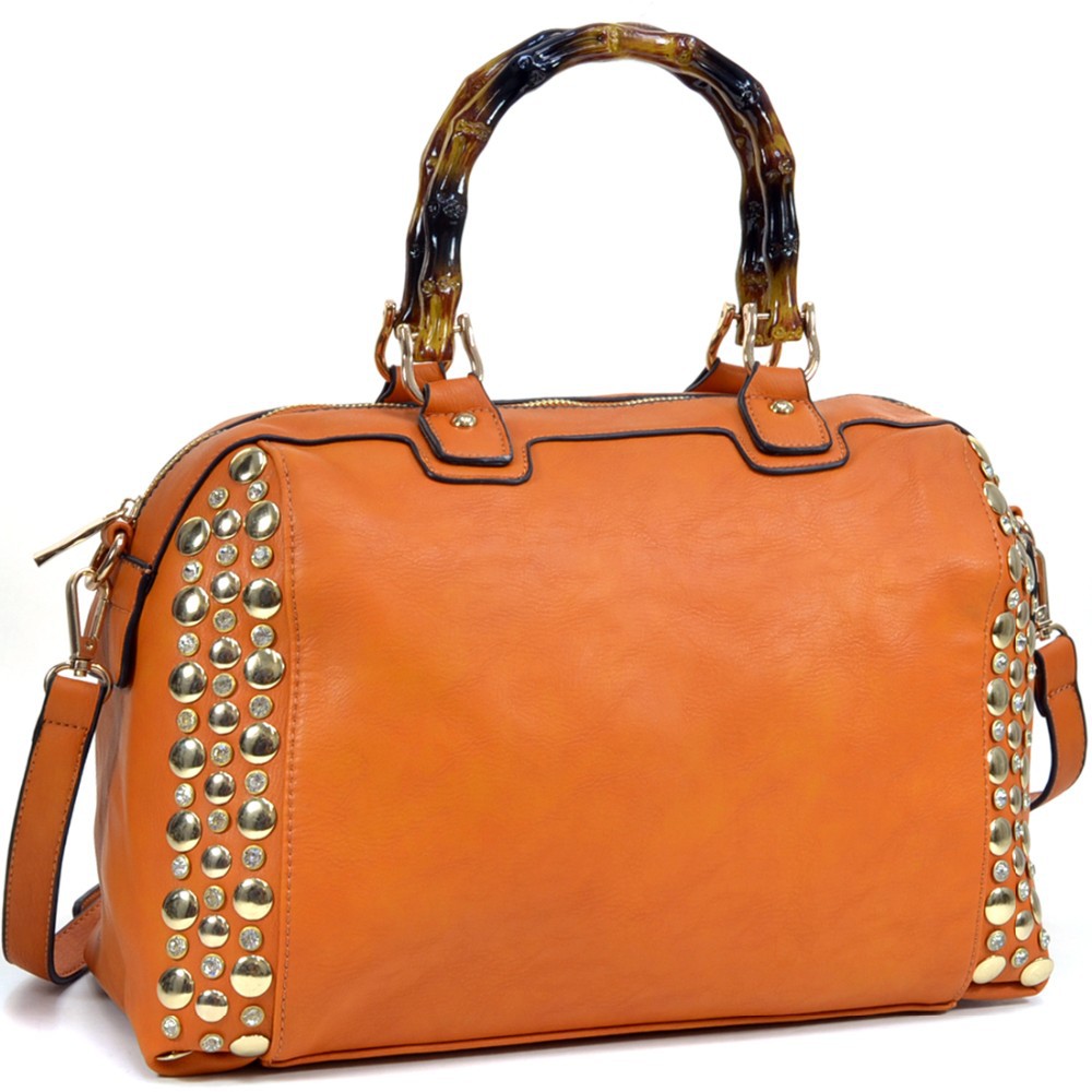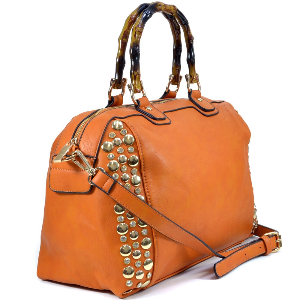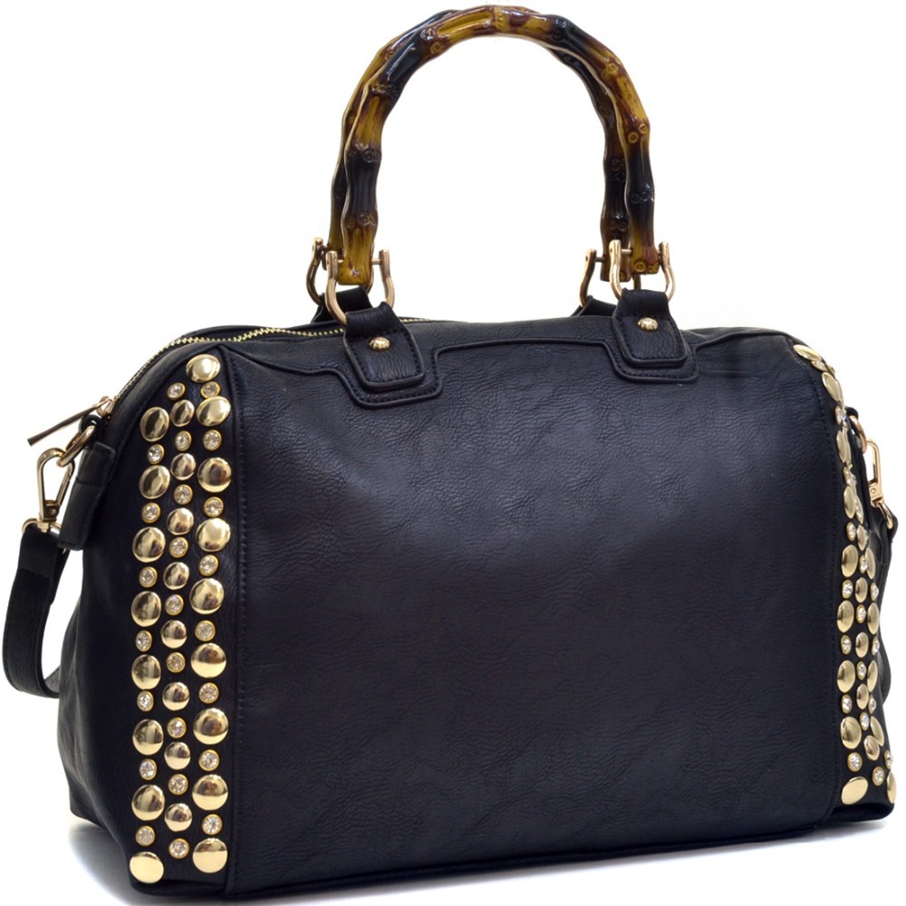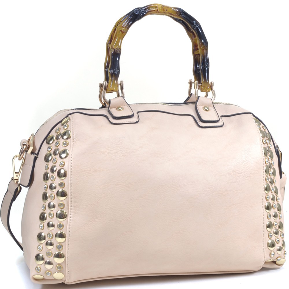 Rhinestone Studded Bamboo Handle Flat Bottom Bag w/ Shoulder Strap