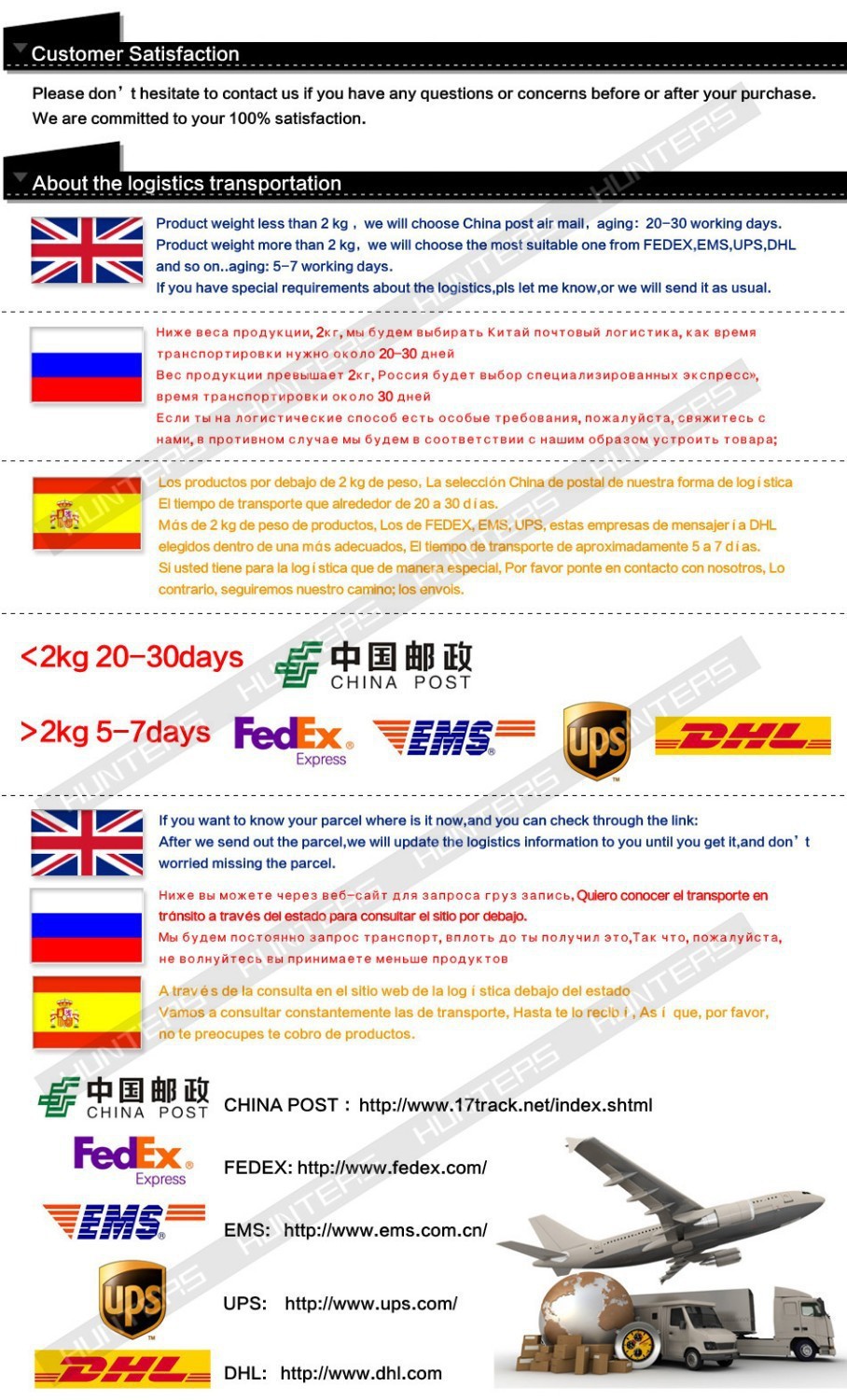 Timely Shipping. We will send out your items within 48hours once the payment was confirmed. Use China Post Air Mail: about 12~30 days to delivery. Use EMS: about 5~10 days to delivery. Use DHL: about 4~7 days to delivery. Save Payment Method with Escrow Service. All the payment will send by Escrow payment service, the payment would be released after you confirm the delivery. If you have any questions, please contact us ! we will response you in timely. Drop Shipping Services. The Drop shipping is a common way on trading. The order will be sent directly to your customer. Fastly and Safely. Just place an order and note your customer address, then we will do the rest of work. Save the time and money. It is welcome to show our products pictures to your customer. Wholesale Services. We also do wholesale, if you want to place a bulk order, please send your inquiry we will offer you wholesale price, big discount and special services. Mix Order Acceptable. We can supply many items, you can login in our store to check all items. We can accept mix order with different Brands, Styles, Sizes and so on. It is available to do Drop shipping and wholesale too. Please feel free to contact us if you want different items from our store. Just compare and try the best deals here! A try a great step to your long successful business!