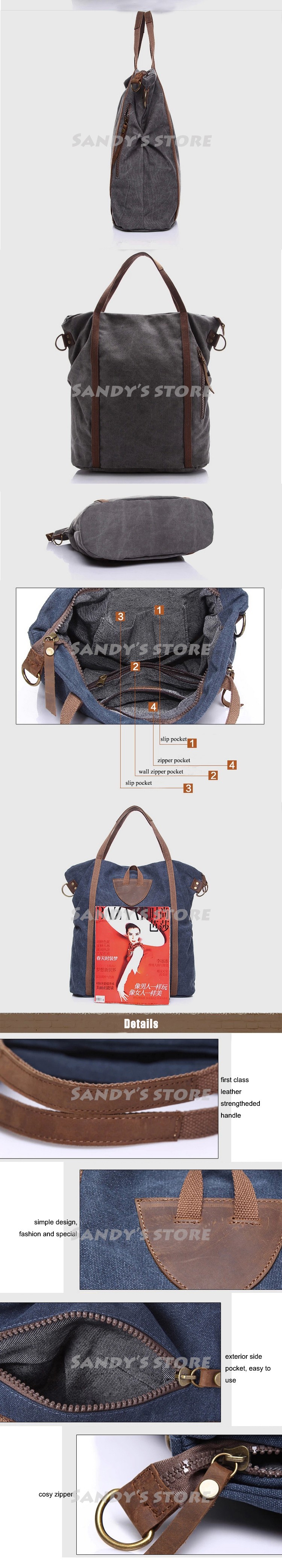 This is a fashion canvas bag with first-class leather handles, roomy comfortable with a exterior pocket and 3 interior pockets. Could be the perfect one for an every use and yet still maintains a casual and elegant look. It could be good as a shopping bag, book bag, disper bag, beach tote bag or weekender bag. Simple, Stylish, Modern, Pretty, and Special. A nice gift for your friend and family.