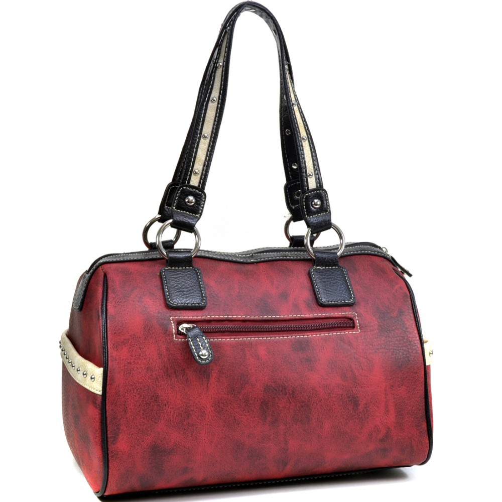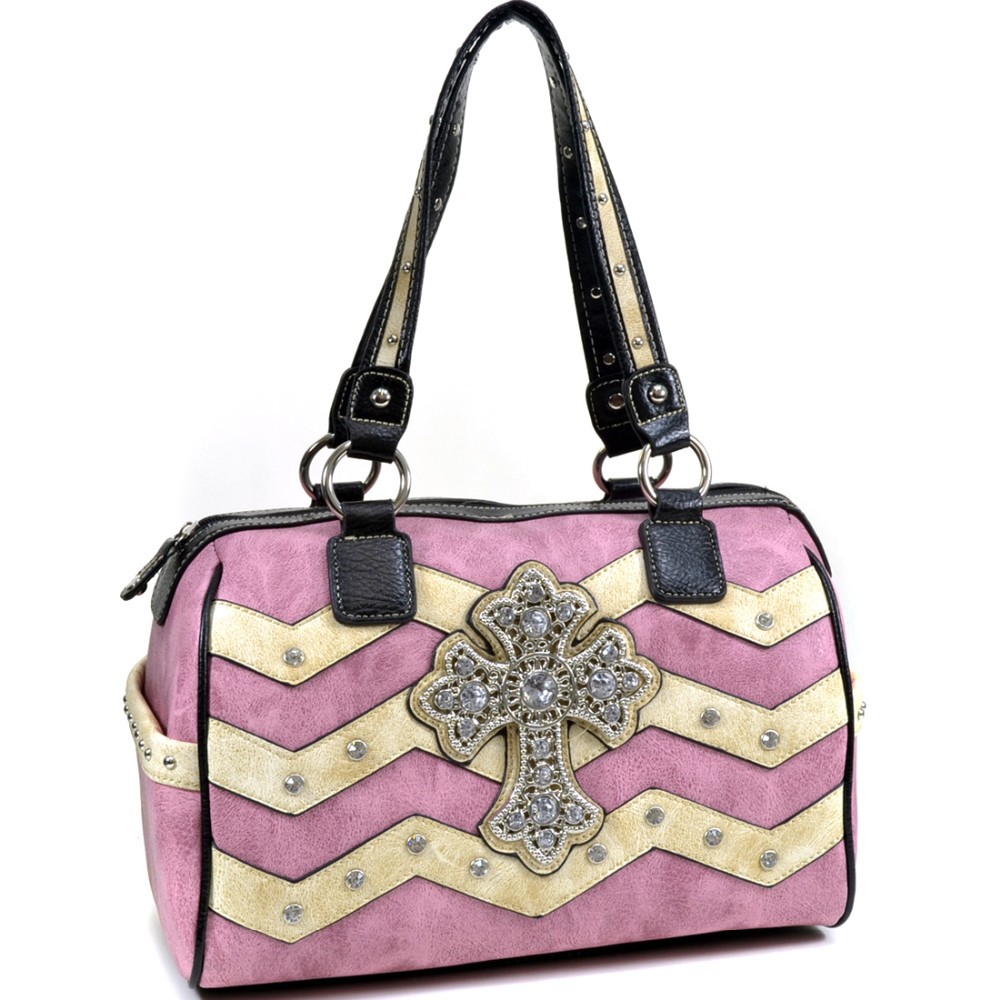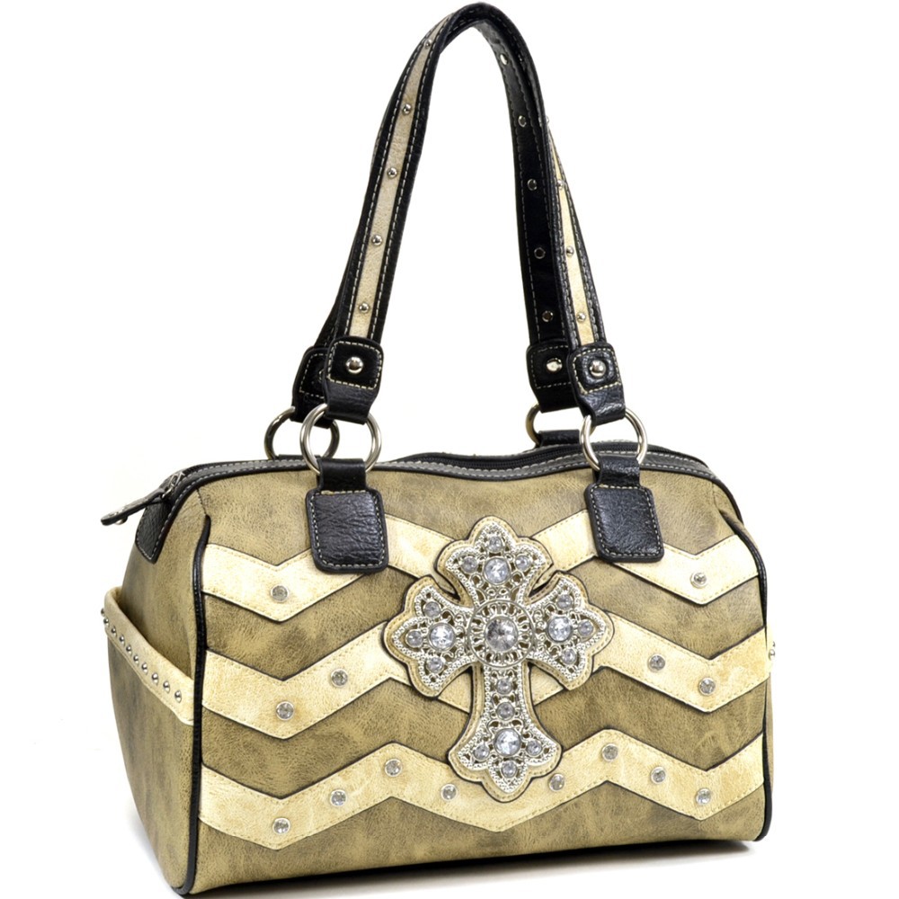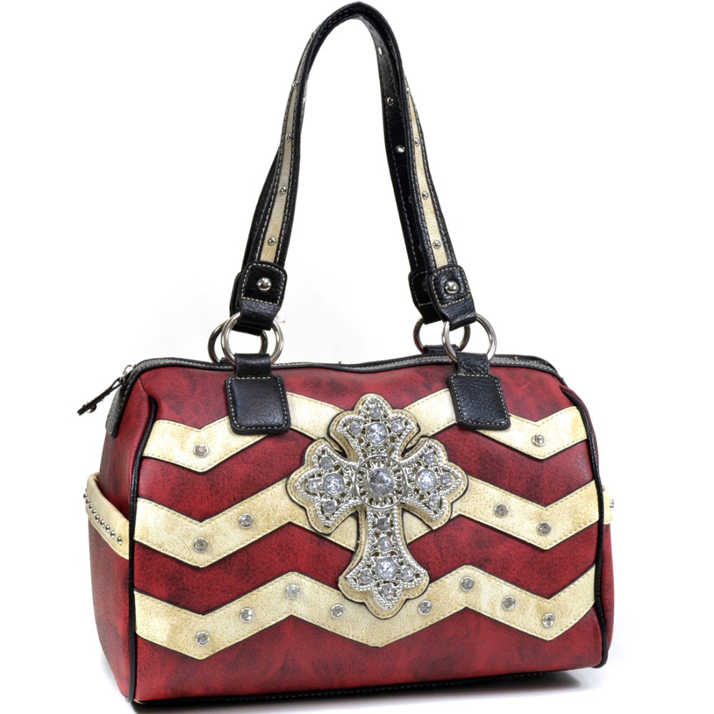 Fierce yet elegant, this one-of-a-kind bag is perfect for all your fashion and storage needs. Featuring distressed faux leather and bold cross and rhinestone accents, this satchel bag is perfect for adding flair to your outfit a-kind satchel bag features bold leopard accents and luxurious gold accented hardware. Transform this lovely bag into a cross-body bag easily with the removable shoulder strap.