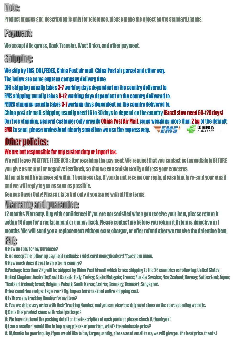 Return PolicyIf the product you receive is not as described or low quality, the seller promises that you may return it before order completion (when you click "Confirm Order Received" or exceed confirmation timeframe) and receive a full refund. The return shipping fee will be paid by you. Or, you can choose to keep the product and agree the refund amount directly with the seller.