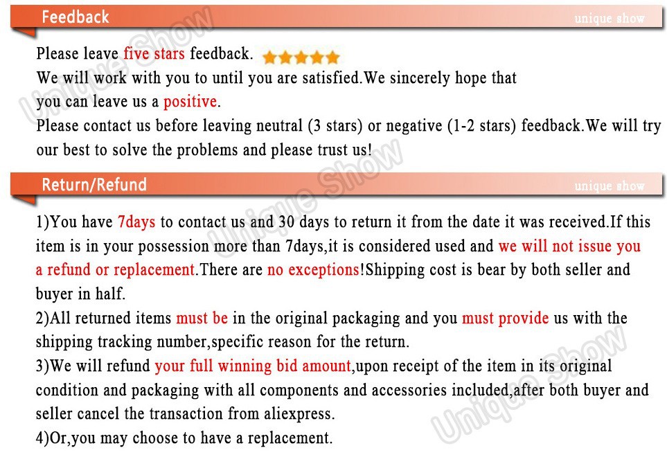| Return Policy | If the product you receive is not as described or low quality, the seller promises that you may return it before order completion (when you click "Confirm Order Received" or exceed confirmation timeframe) and receive a full refund. The return shipping fee will be paid by you. Or, you can choose to keep the product and agree the refund amount directly with the seller. N.B.: If the seller provides the "Longer Protection" service on this product, you may ask for refund up to 15 days after order completion. |