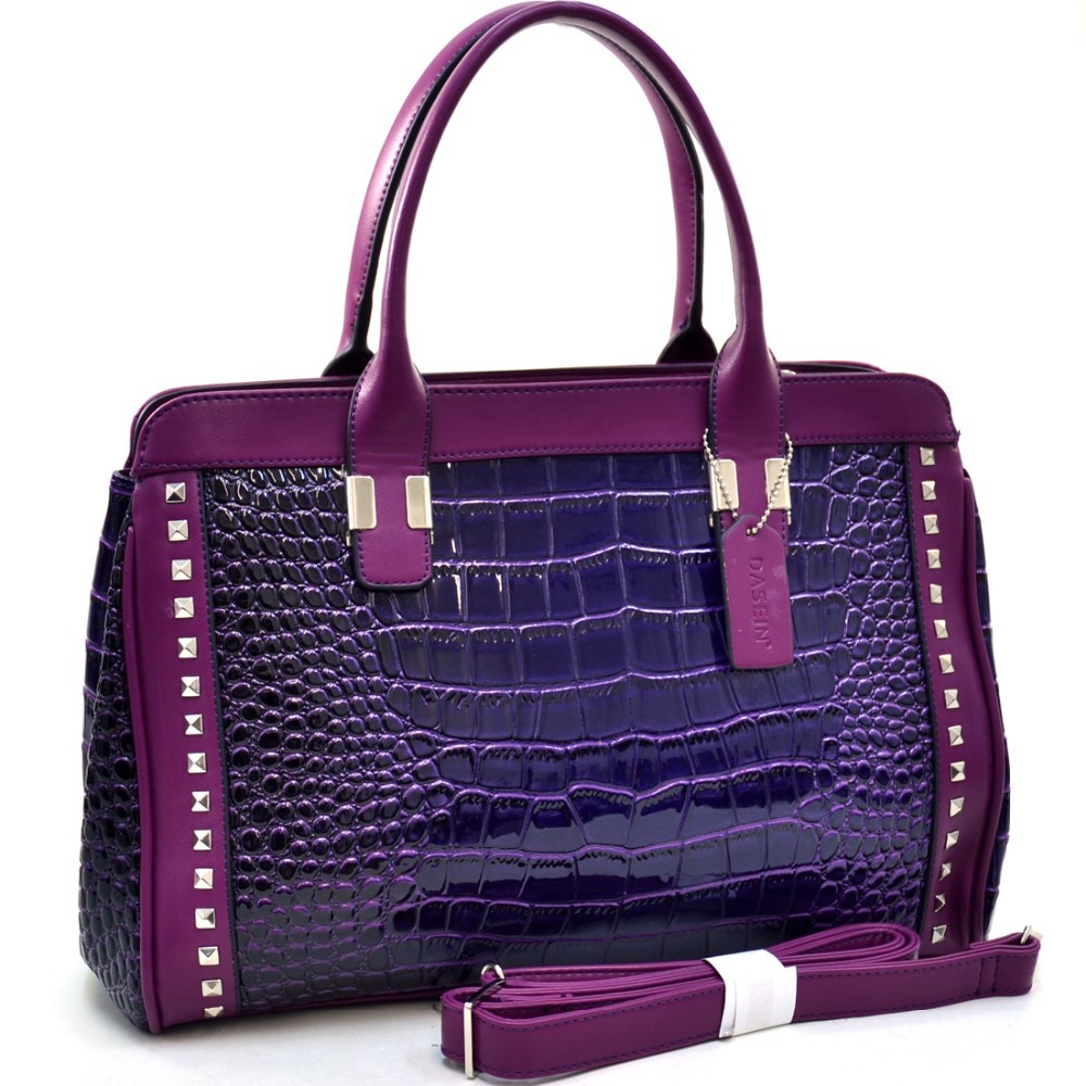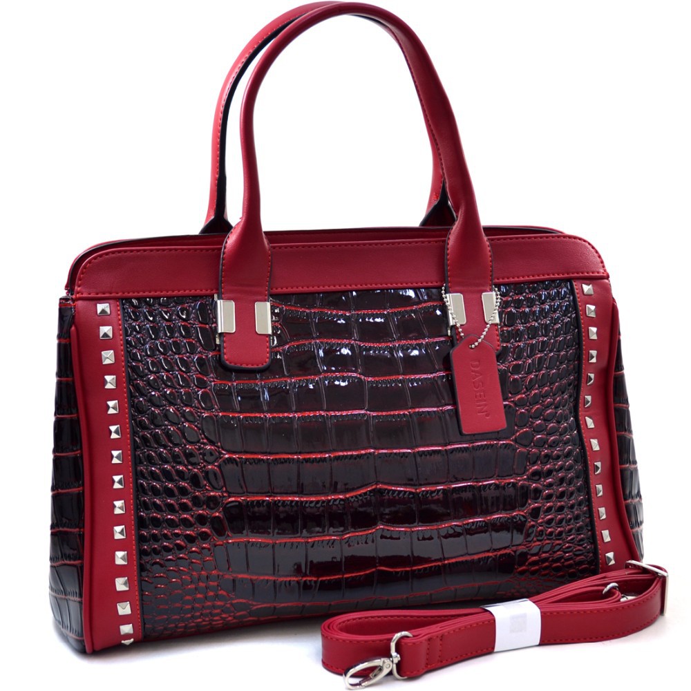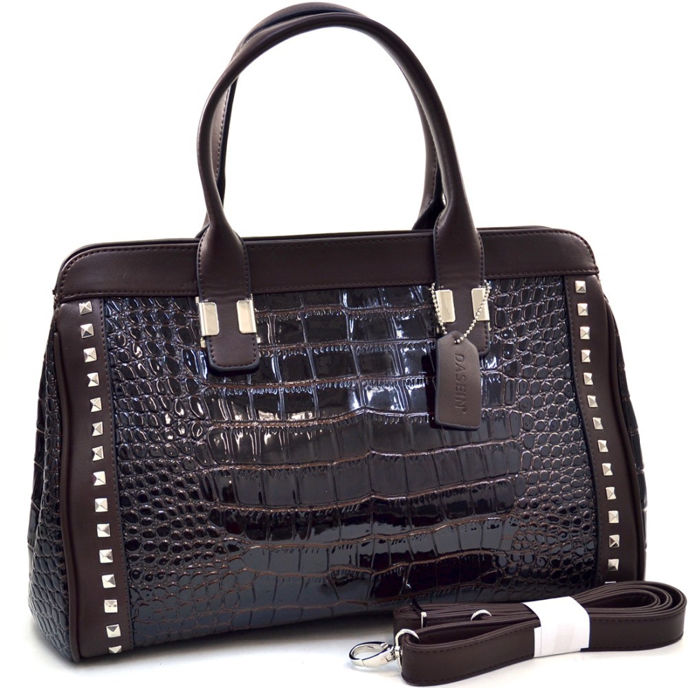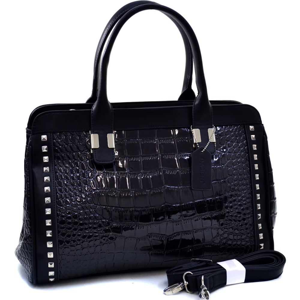 The classic patent croco satchel now features some edgy pyramid studs. This rocker inspired handbag is great for everyday use if you have a lot to carry with you. This satchel is sleek on the outside but is spacious enough on the inside to fit a tablet if you need to stay connected on the go. Included is a 45″ bonus strap for you to wear this bag over your shoulder.