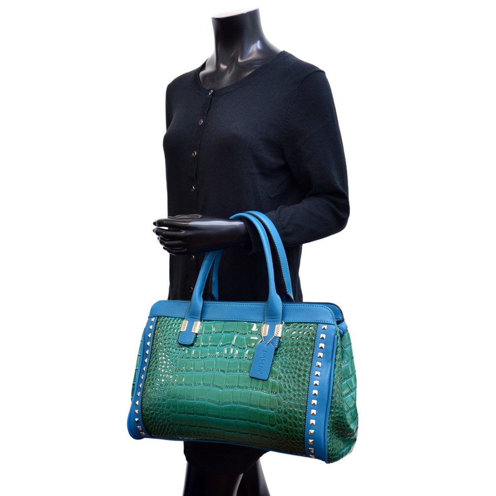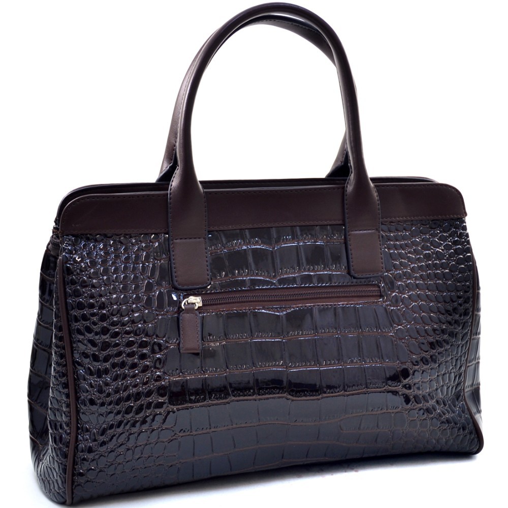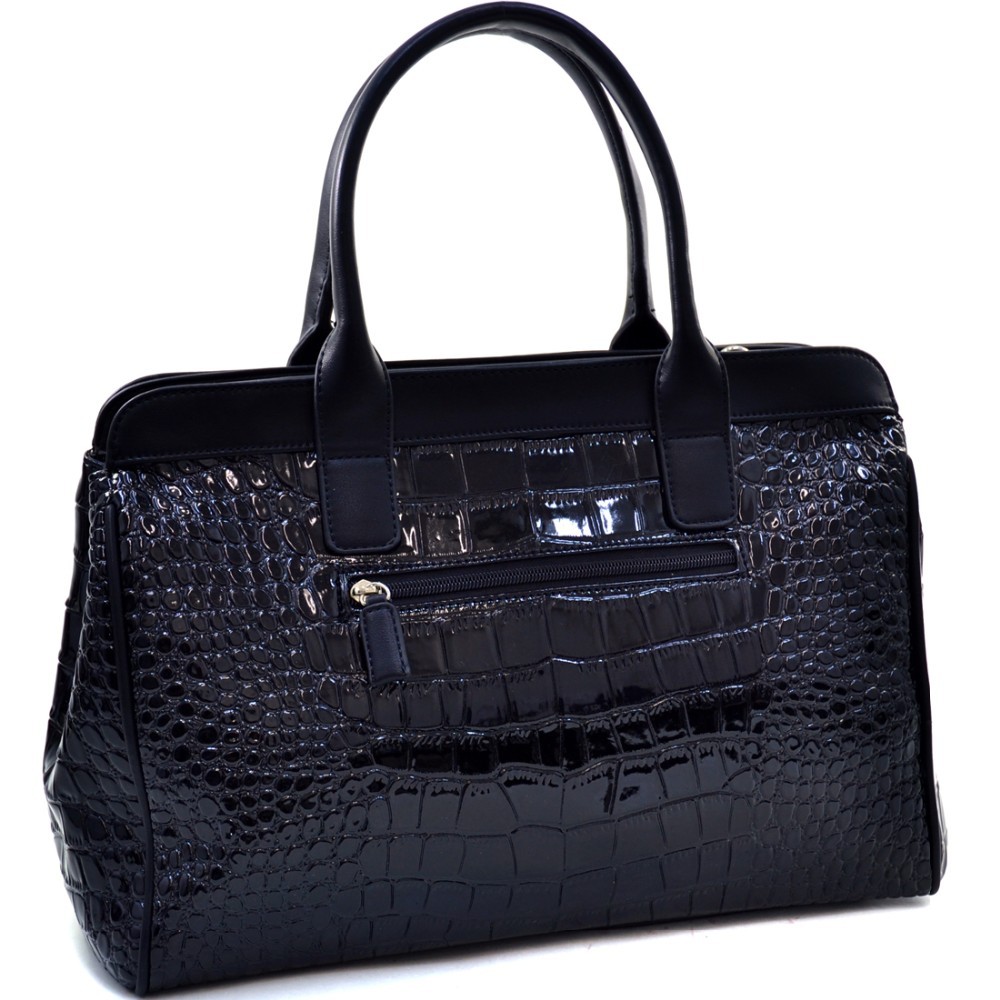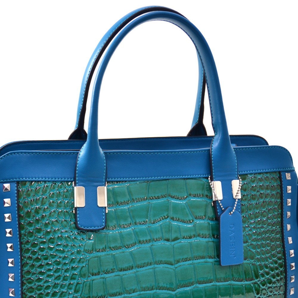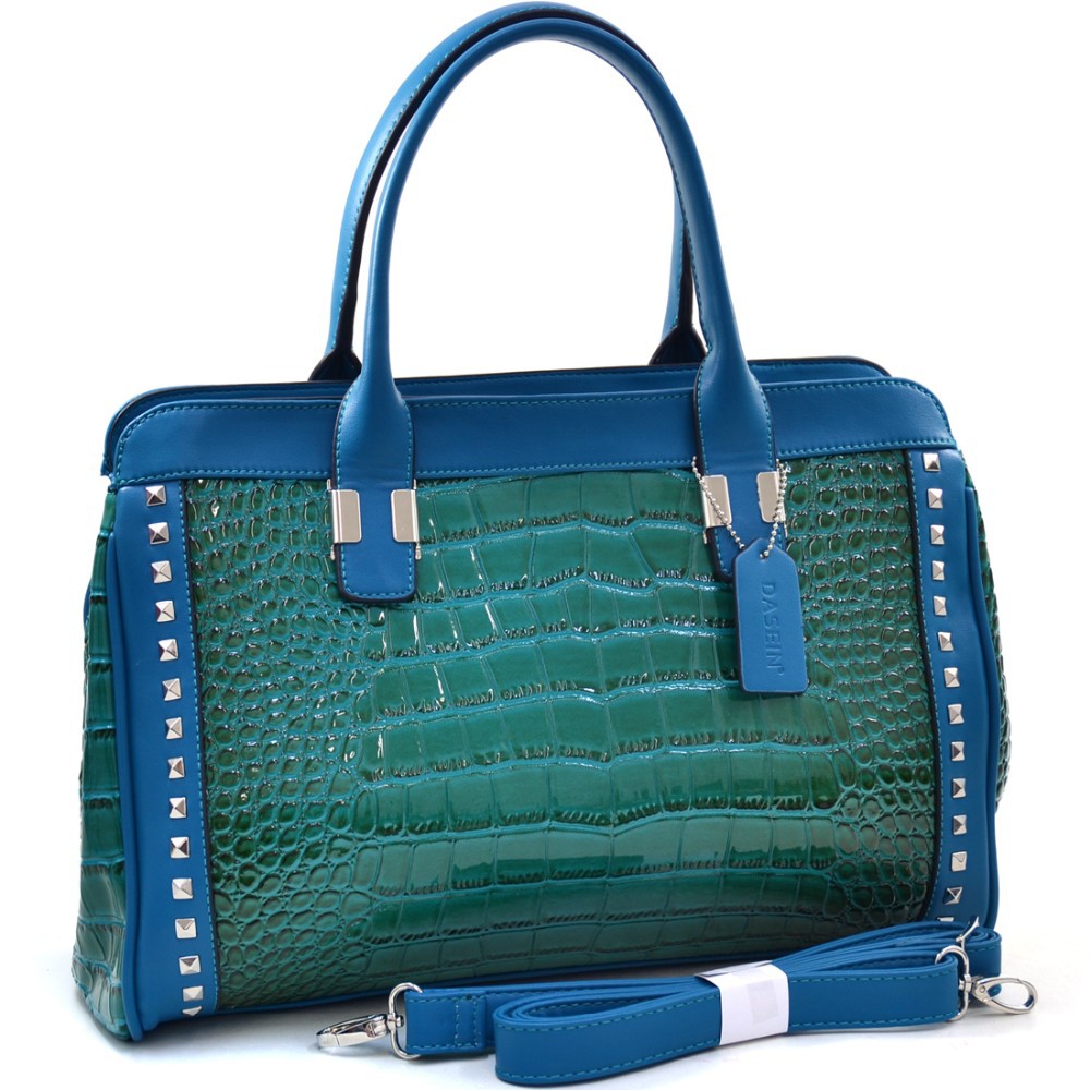The classic patent croco satchel now features some edgy pyramid studs. This rocker inspired handbag is great for everyday use if you have a lot to carry with you. This satchel is sleek on the outside but is spacious enough on the inside to fit a tablet if you need to stay connected on the go. Included is a 45″ bonus strap for you to wear this bag over your shoulder.